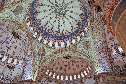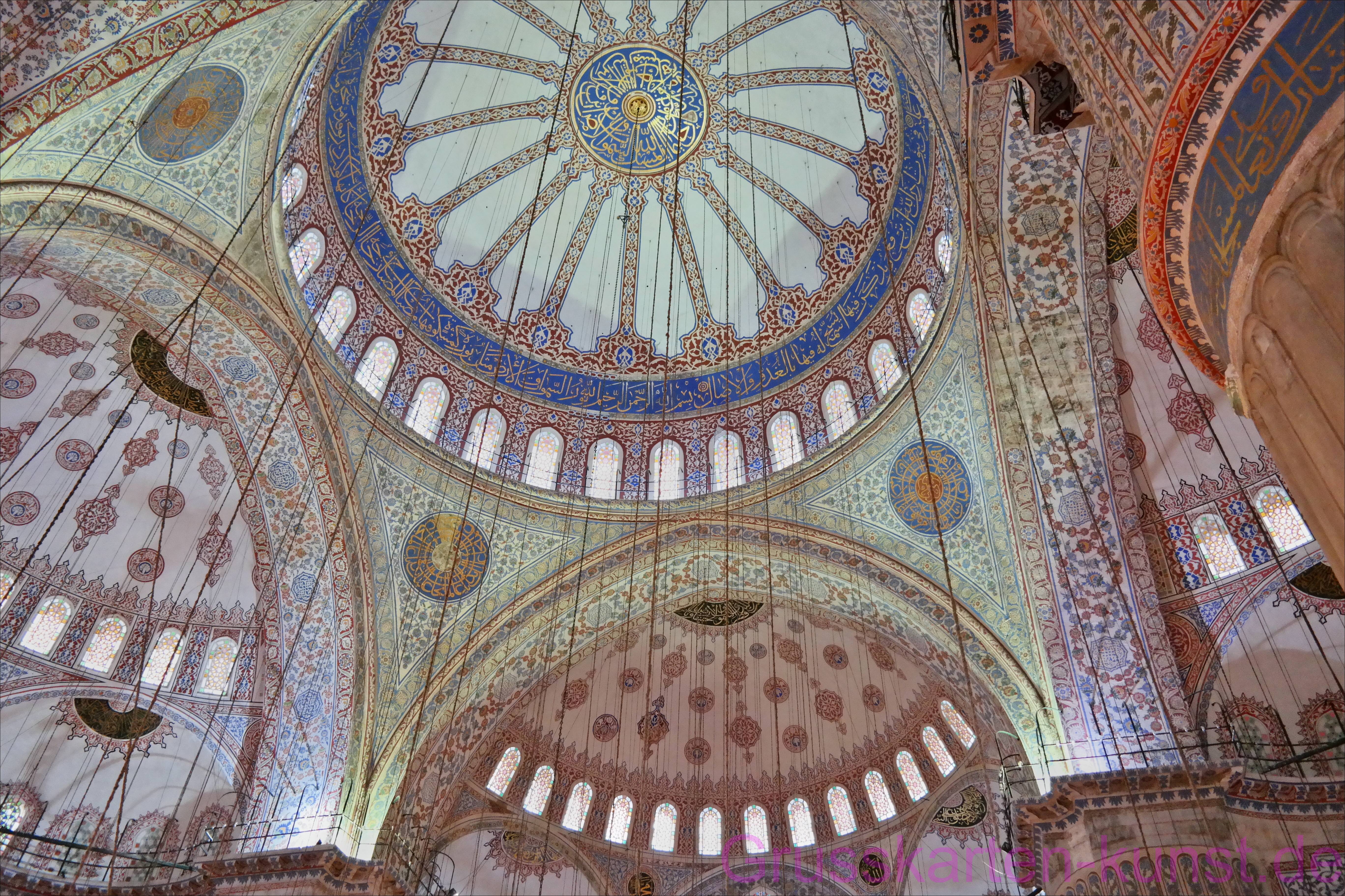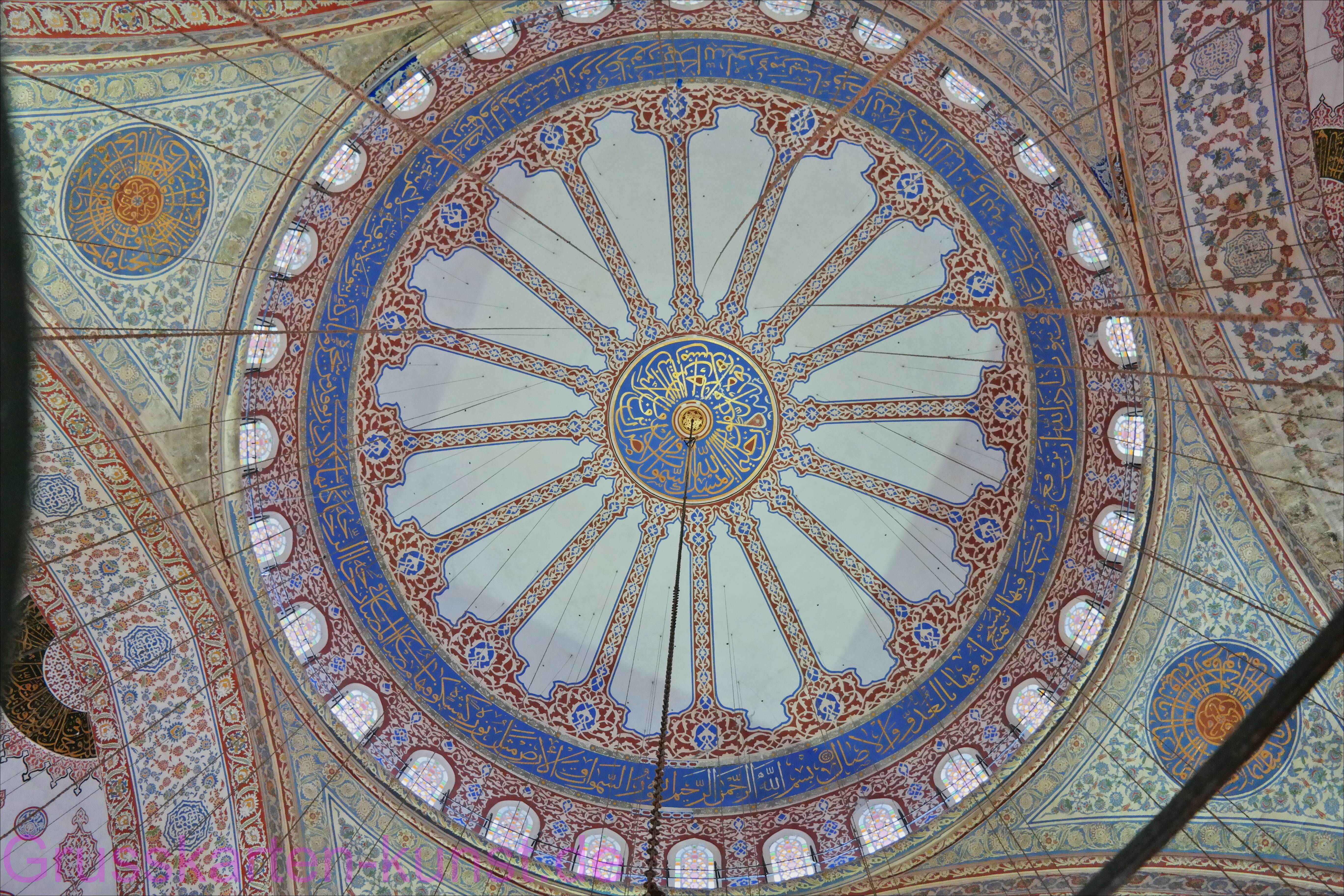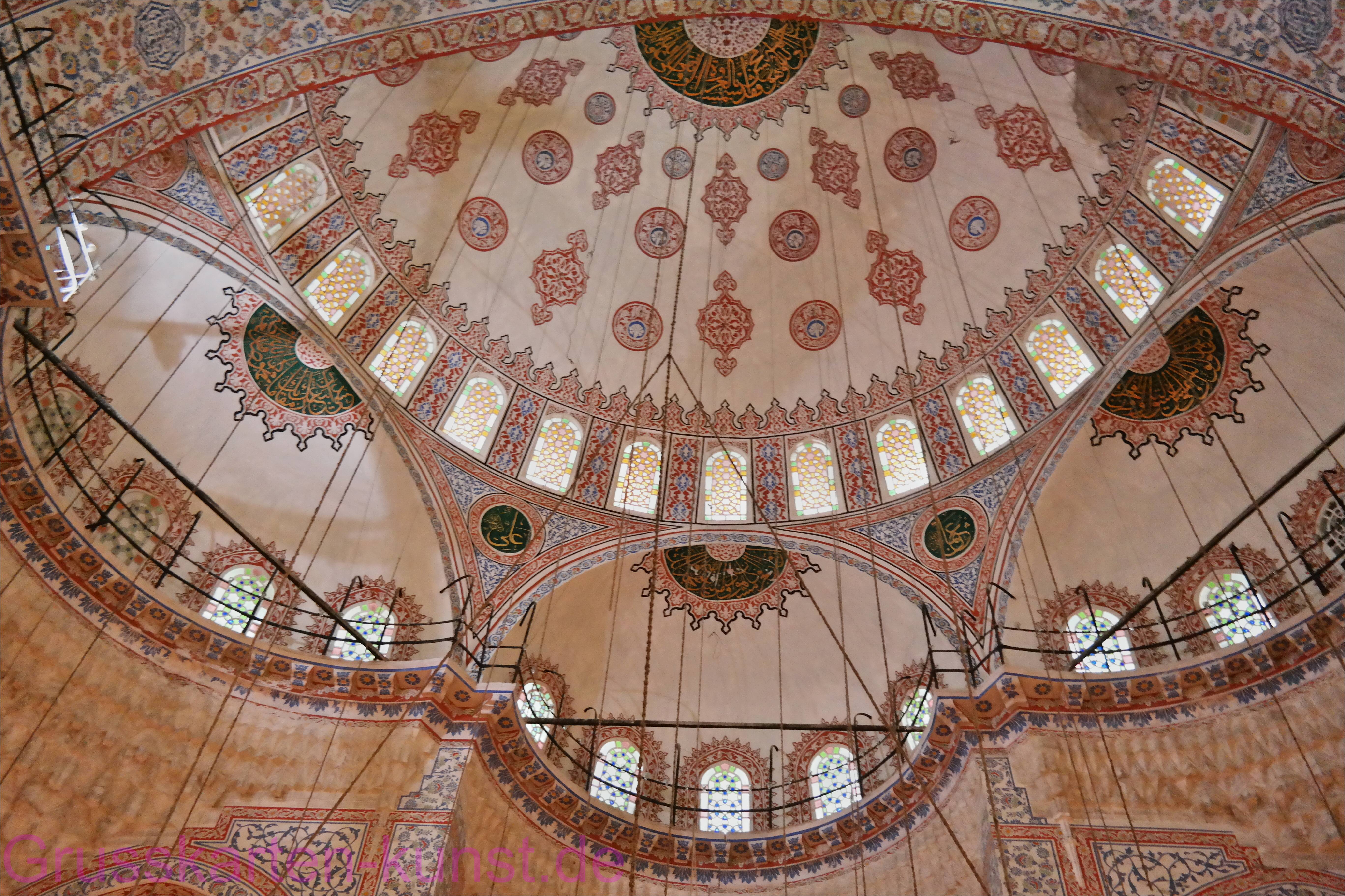 | R39 Sie sehen das Gewölbe der blauen Moschee, einer der berühmtesten Gotteshäuser der Welt. Die blauen Iznik Kacheln aus byzantischer Zeit geben ihr ihren Namen. Neben der traditionellen blau-weißen Kacheln findet man heute auch türkise violette grüne und rote Kacheln mit floralen chinesischen und arabischen Motiven. Die quadratisch aneinandergefügten Kacheln zeigen kein abgeschlossenes Bild, vielmehr kann man das floral filigrane das man von Weit unten erkennen kann als Puzzleteil bezeichnen, mit immer wiederkehrenden Mustern. Jede Kuppel hat ihr eigenes Aussehen. Hier schauen Sie schräg nach oben in die Hauptkuppel und 3 weitere, tragende Halbkuppeln, alle mit Fenstern. Helle Türkis und Blautöne, sowie dezente Weiß- und Terracottatöne bilden hier den Gesamteindruck. Säulen und Rundbögen mit je 5 m Durchmesser (eine ist am Rand zu sehen) tragen die 43 m hohe Hauptkuppel mit 23,5 m Durchmesser die von Halbkuppeln umringt ist. Mit ihren sechs Minaretten gehört sie neben Mekka zu den seltensten Exemplaren. Nachts beleuchtet sieht sie wie in Gold getaucht aus. Interessant ist auch der Geruch, der wohl von mit barfuß oder Socken zu betretenen Teppich ausgeht, der dazu dient, Knie und Stirn beim Beten zu schonen. Freundlich bestimmt wird man in Moscheen auf das Tragen eines Kopftuches ( Frauen ) und ausziehen der Schuhe hingewiesen. Wenn Sie den roten Teppich sehen wollen, fragen Sie nach! Mail mit der Karte R39 versenden Karte R39 vergrößern | |