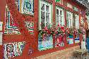 | R41 Fachwerkhaus mit ochsenblutrotem Holz, moosgrünem Fensterrahmen und weißen Sprossenfenstern. Darunter hängen rot- und orangerotfarbene Geranien in Balkonkästen. Langweilig? Nein! denn die unterschiedlich großen dreieckigen, trapezförmigen und rechteckigen Gefache sind mit genau passend gestrickten und gehäkelten bunten "Wandteppichen" verziert. Sie erinnern an Gemälde von Friedensreich Hundertwasser und so bekommt das Haus seinen ganz besonderen Reiz. Toll, diese Strickfrauen aus dem Amöneburger Becken! Mail mit der Karte R41 versenden Karte R41 vergrößern | |