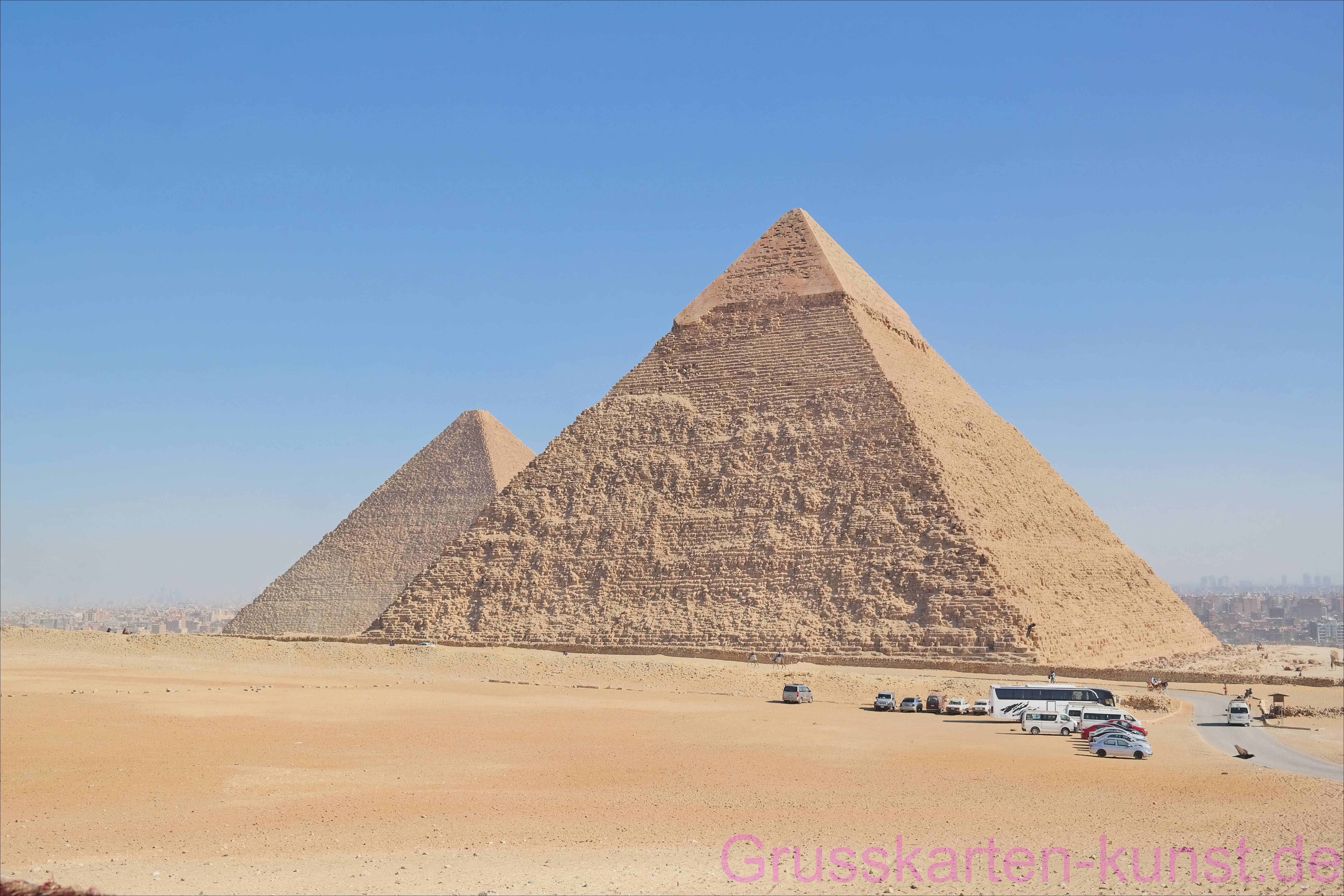 | R 43 Die Pyramiden von Gizeh hat wohl fast jeder schon irgendwo gesehen, aber plötzlich da zu sein, das Panorama zu erleben, ist für Sehende schon was besonderes. Für nicht sehende, versuche ich meine Gefühle vor Ort zu beschreiben. Am Tag vorher haben wir die Alabastermoschee über Kairo besucht. Nichts ahnend sauge ich das Panorama der unter mir liegenden Stadt auf. Am Horizont die eckigen Silhouetten der Hochhöäuser. Klack - was ist das ?unglaublich, zwei dreieckige Silhouetten ragen aus dem Dunst in den Himmel. Wochenlang vorher darauf gefreut, haut es mich nun um. Damit hatte ich nicht gerechnet. Unwirklich, diese 20 km entfernten Formen am Horizont. Tags drauf fahren wir mit dem Taxi durch die Stadt. Auch hier, nichtsahnend - wow - mitten aus dem Städtebaulichen Getümmel plötzlich ein erster Blick auf das Hochplateau mit den 2 zuerst sichtbaren Quadratpyramiden. Mir stehen die Tränen in den Augen, endlich sehe ich eines der 7 Weltwunder. Wenig später laufen wir die Anhöhe hoch, sehen direkt vor uns dieses riesige Dreieck in den Himmel ragen. Die Sonne scheint, der Himmel ist blau, noch wenig Menschen da, ein kühler Wind. Nach wenigen metern zu Fuß chartern wir eine Pferdekutsche und lassen uns durch den aufgewirbelten Wüstenstaub fahren. Von einem hohen Punkt aus haben wir einen atemberaubenden Anblick auf die 3 größen und einige kleinere Pyramiden. Wir lachen und scherzen, stehen im Staub, machen Fotos bei traumhaft blauem Himmel. Hier sehen Sie (vor diesem Himmel) 2 der größten Pyramiden zu ihren Füßen liegen, wo der gelblich-rote Sand unendlich scheint und die Stadt Kairo am Fuße der Pyramiden in einer Mulde liegt. Die Pyramiden, deren Bau ca. 20 Jahre dauerte, liegen etwas weiter weg vom pulsierenden Leben der Stadt, als es bei der Akropolis ist. Die Mächtigkeit der ca.138m hohen und 200m langen Pyramiden ist aber unvergleichlich. Über Zweieinhalb Millionen 2,5 tonnen schwere Quader von durchschnittlich 1,60 mal1,60 mal 1,80m, treppenartig in die Höhe gestapelt. Die ersten 3 Stufen habe ich erklommen, bis oben würde es ewig dauern... Hallo hier bin ich ! möchte ich rufen. Ein großes und ganz kleines Gefühl. Am Nachmittag wartet die Medina von Kairo auf uns. Jahrtausende blicken auf uns. Mail mit der Karte R43 versenden Karte R43 vergrößern | |