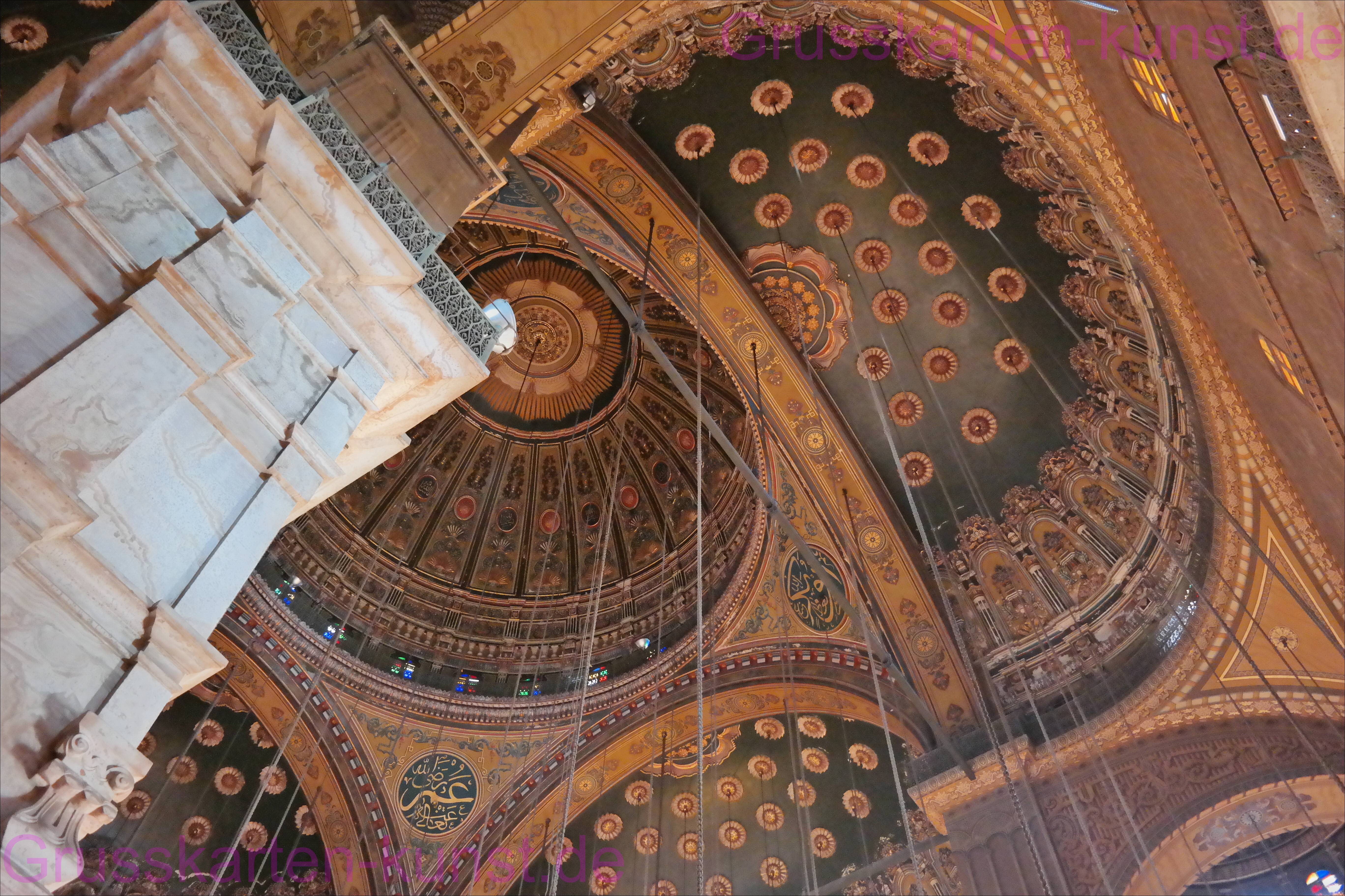 | R44 Kuppeln von Moscheen faszinieren immer wieder. Was die Baumeister sich da immer ausdenken, ist oft unfassbar schön, wirkt in der Gesamtheit und ist im Einzelnen kaum zu beschreiben. Eine der ältesten Moscheen Kairos ist die Alabastermoschee Muhammad Ali) mit 80 Meter hohen Minaretten, die wie gespitzte Bleistifte in den Himmel ragen. Ein monumentales Bauwerk über der Altstadt von Kairo mit Blick auf die "Skyline" mit dem besonderen Kick - 2 dreieckige Hochhäuser am Horizont? ... Hier aber habe ich eine rose-weiße Marmorsäule mit reichlich Verzierungen empor fotografiert. In der Mitte des Bildes die 52 Meter hohe Hauptkuppel umgeben von vier Halbkreiskuppeln, alle mit kleinen Buntfenstern umrandet, die etwas Licht einlassen. Ursprünglich wurde mit Öllampen beleuchtet, heute hängt ein riesiger Leuchter mit hunderten von Lämpchen kreisförmig von der Decke(nicht zu sehen). Vorherrschende Farben sind Kastanienbraun, goldbeige und warme, dunkle Rottöne. Die Verzierungen sind teilweise in Gold und von osmanischem Stil aber auch mit barocken Elementen. Während die Kuppeln der Dresdner Frauenkirche oder auch der Blauen Moschee in Istanbul eher hell wirken, dominiert hier eine dunkle, edle Stimmung, die aber von hellen Säulen und prunkvollen Kanzeln begleitet wird. Habe versucht, diesen Kontrast durch meine Perspektivwahl festzuhalten. Das macht auch für Nichtbesucher einen schönen Anblick, der Raum zur Phantasie lässt. Mail mit der Karte R44 versenden Karte R44 vergrößern | |