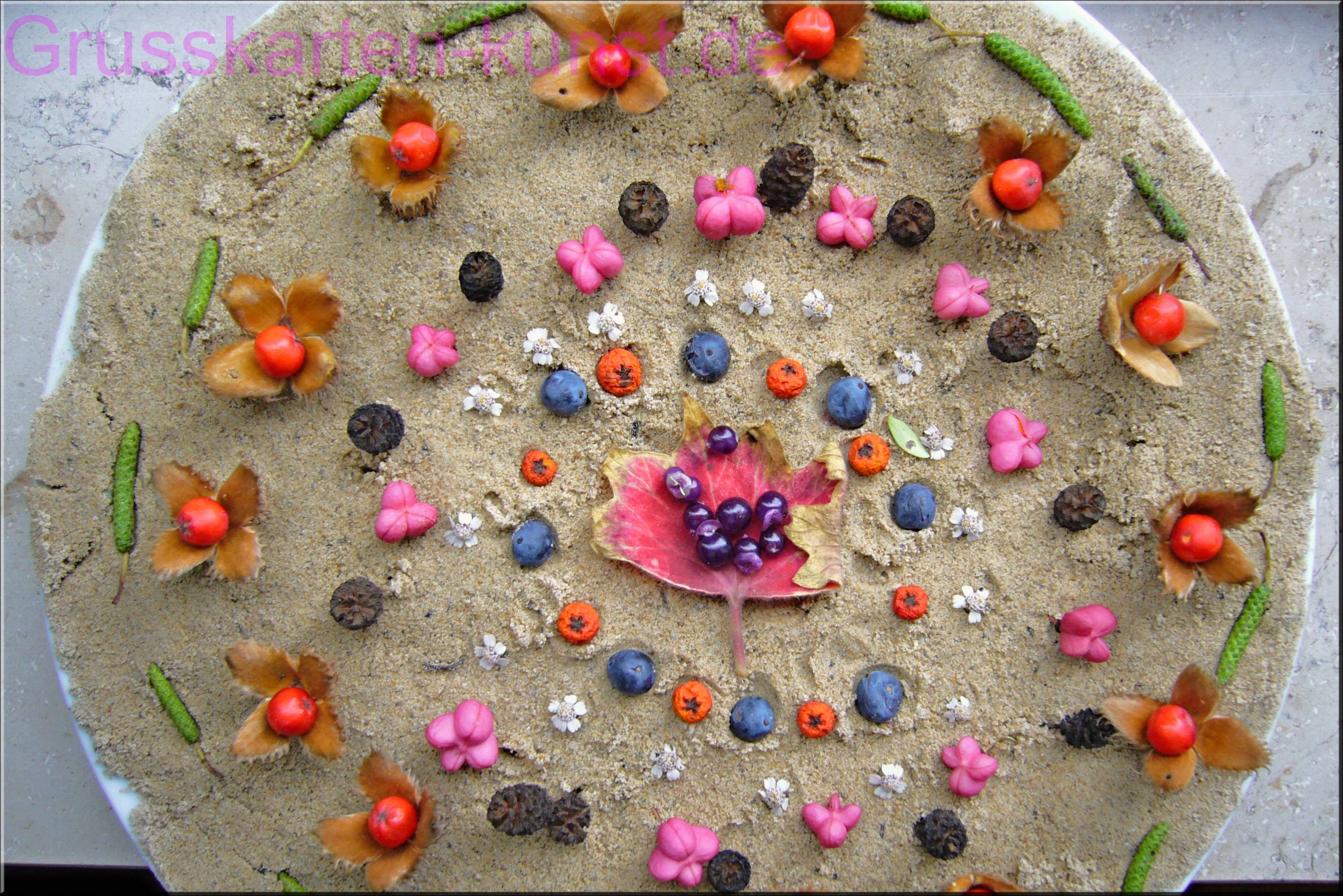 | N01 In der Schule machten wir Mandalas aus Früchten des Spätsommers. So entstanden wunderbare Kunstwerke, die einige Wochen halten werden. Wir füllten einen Teller mit Sand, damit die Beeren nicht wegrollen können. Leonies Mandala besticht durch die dominante Farbkomposition von Rosa und Brauntönen. In die Mitte legte sie ein pink-braunes Blatt einer Geranie. Hierauf verteilte sie einige lilafarbene Beeren. Es folgt ein Ring aus abwechselnd orangen und blauen Beeren, die wiederum eingerahmt werden aus zarten, weißlichen Blüten. Der nächste Ring besteht aus rosa „Knospen“ und braunen mini- Zapfen. Jetzt steckte sie die vierflügeligen, braunen Hülsen der Bucheckern darum und legte liebevoll in jeden dieser Kelche eine rote Vogelbeere. Den Rand gestaltete sie mit den länglichen, frischen grünen Fruchtständen der Birke. Wow! Mail mit der Karte N01 versenden Karte N01 vergrößern | |