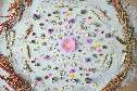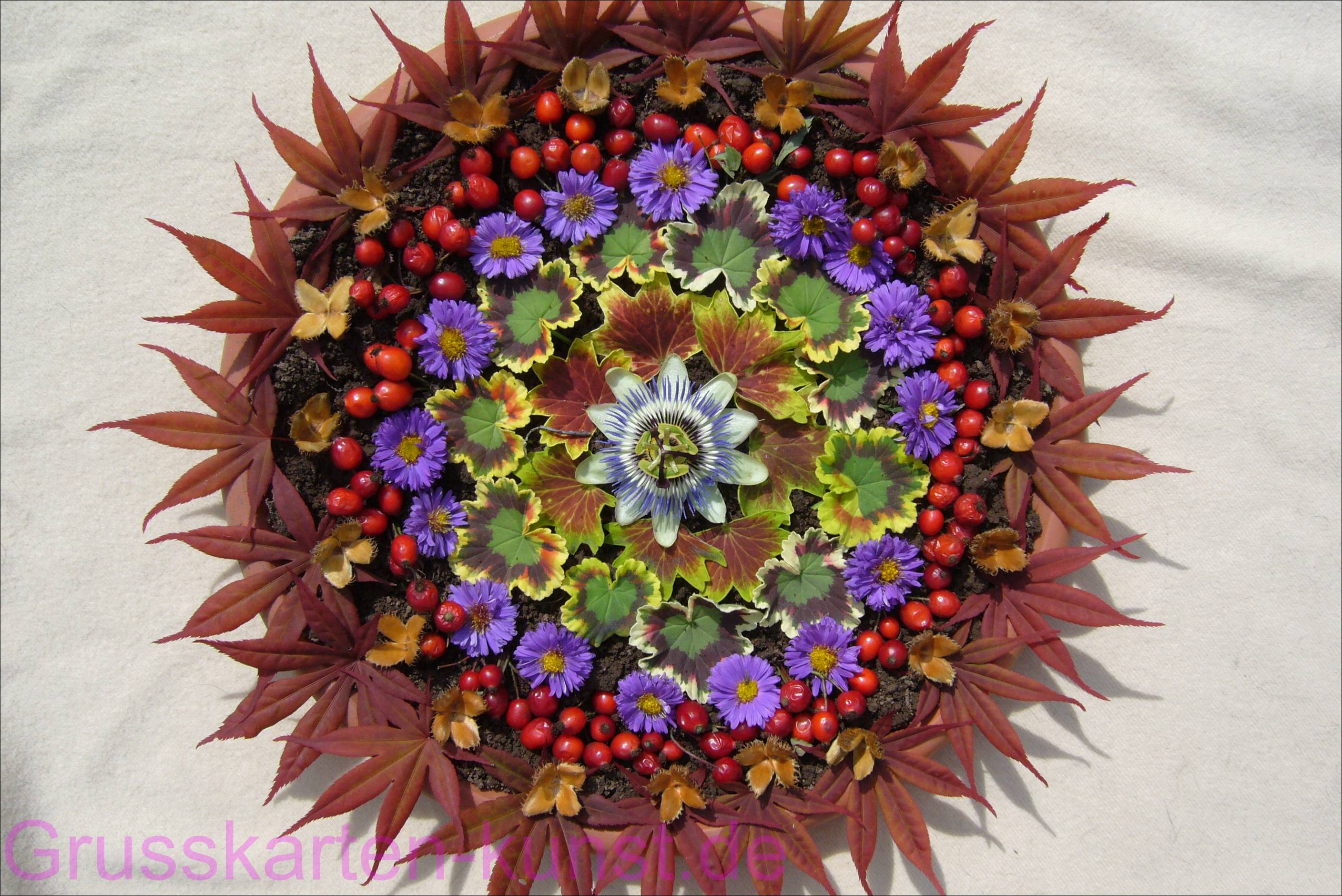 | N03 ** Mandala auf brauner Muttererde. Mittig die feine und bizarre blau-gelb-grüne Blüte der Passionsblume, darum samtrote, gezackte Blätter der Geranie mit grünem Rand. Nun eine weitere Reihe Geranienblätter mit den Farben Grün, Rot, Gelb, wobei diese eher rundliche Ränder haben. Hierum wurden 16 lila Blüten mit gelber Mitte der Aster gelegt, die widerum von roten Früchten eingefasst sind. Die sternförmigen, geöffneten Hülsen der Bucheckern bilden mit roten Blättern des Fächerahorns, die wie Sonnenstrahlen nach außen gerichtet sind, den Abschluss. Dieser Teller steht auf einem hellen Hintergrund, den auch die äußeren Blätter der Passionsblume haben. Ein runder Abschluss. Mail mit der Karte N03 versenden Karte N03 vergrößern | |