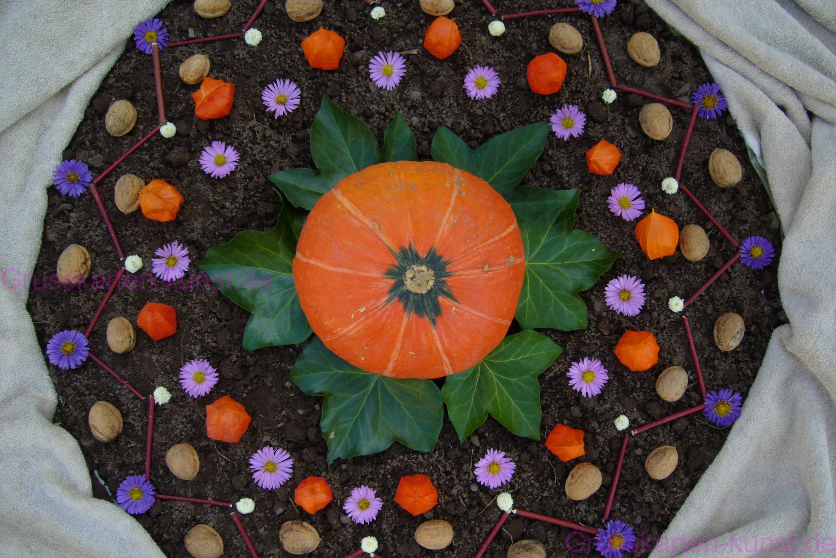 | N04 In der Mitte liegt ein orangener Hokkaido- Kürbis um dessen beigen Strunk ein grüner, ausgefranster Kranz sichtbar ist. Strahlenförmig durchziehen 10 „Nähte“ den Kürbis. Er liegt auf einem Bett aus grünen Efeublättern, deren hellgrüne Adern die „Strahlen“ fortsetzen. Es folgt ein Ring aus 14 helllila Asternblüten, und ein Ring aus orangenen Lampionfrüchten. Mit den roten Ästen vom Hartriegel legte ich im Zickzack eine Art 15 eckigen Stern, an dessen inneren Spitzen jeweils eine weiße Blüte vom Tausendschön liegt. An den äußeren Spitzen liegt je eine dunkellila Asternblüte. Im Wechsel dieses Zickzacksterns liegt jeweils innen und außen eine Walnuss. Alles lag 2 Wochen auf einem feuchten Erdbett auf dem Gartentisch, bevor der Regen einen Abbau erforderlich machte. Gediegene, nicht übertriebene Farbkomposition. Mail mit der Karte N04 versenden Karte N04 vergrößern | |