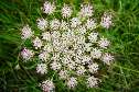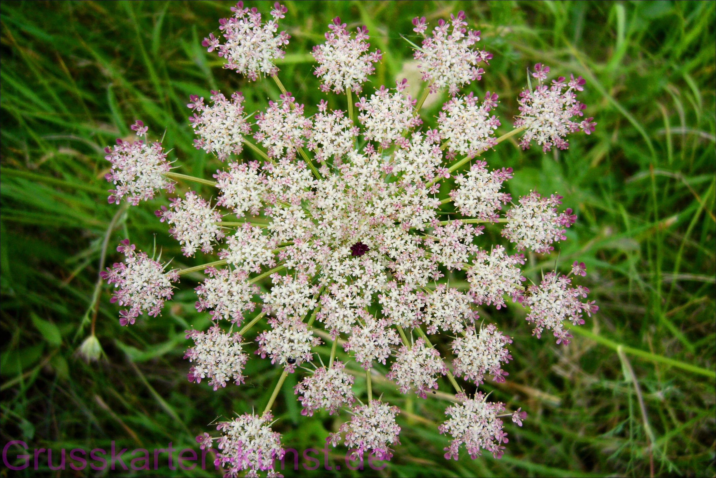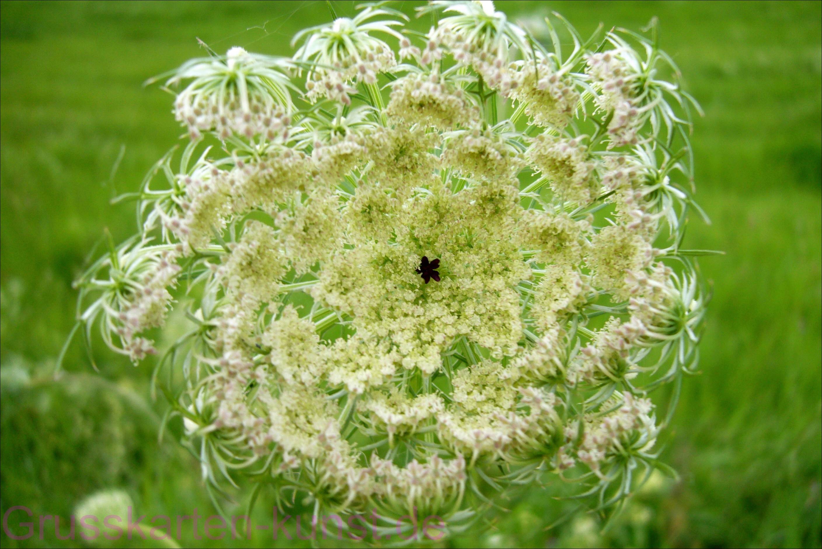 | N08 Verträumt, doch mit wachen Sinnen, schlenderten wir am Wegesrand entlang, auf der Suche nach einer neuen Mandala Idee. Dabei entdeckte ich die jetzt zu Hauf und deshalb fast zu übersehen- den, blühenden weißen Schafgarben, die von Natur aus oft alle Eigenschaften eines Mandalas besitzen. Beim Fotografieren einiger Exemplare stellte ich interessante Dinge fest. Die hier abge- bildete Blüte hat fast 50 kleine, runde Blütensysteme (Teilblütenstände), die sich geometrisch rund um ein virtuelles Zentrum anordnen. Jedes dieser Systeme besteht aus vielen hundert kleinen, stecknadelgroßen weiß bis rosa Blütchen. Vor dem grünen Hintergrund einfach hübsch und für mich wie mehrere Sonnensysteme wirkend. Beim Fotografieren stellte ich fest, dass in fast jeder Gesamt- blütenmitte ein dunkel-lilafarbenes Blütenblättchen steckt. Außerdem öffnen sich die Blüten spiral- förmig, was man in „Mandals09“ gut sehen kann. D.h. die auf den dünnen Stielen stehenden Blüten- systeme sind anfangs noch um den Hauptstengel gewickelt. Das Spiralförmige kann man in einem bestimmten Stadium des sich Öffnens gut erkennen. In einer späteren Phase streben die einzelnen Systeme zu einem Gesamtgebilde immer weiter auseinander, so wie hier bei Mandala 08. Viel Spaß beim selbst entdecken! Sollte es sich für den Kenner hierbei nicht um Schafgarbe handeln... melden! Mail mit der Karte N08 versenden Karte N08 vergrößern | |