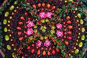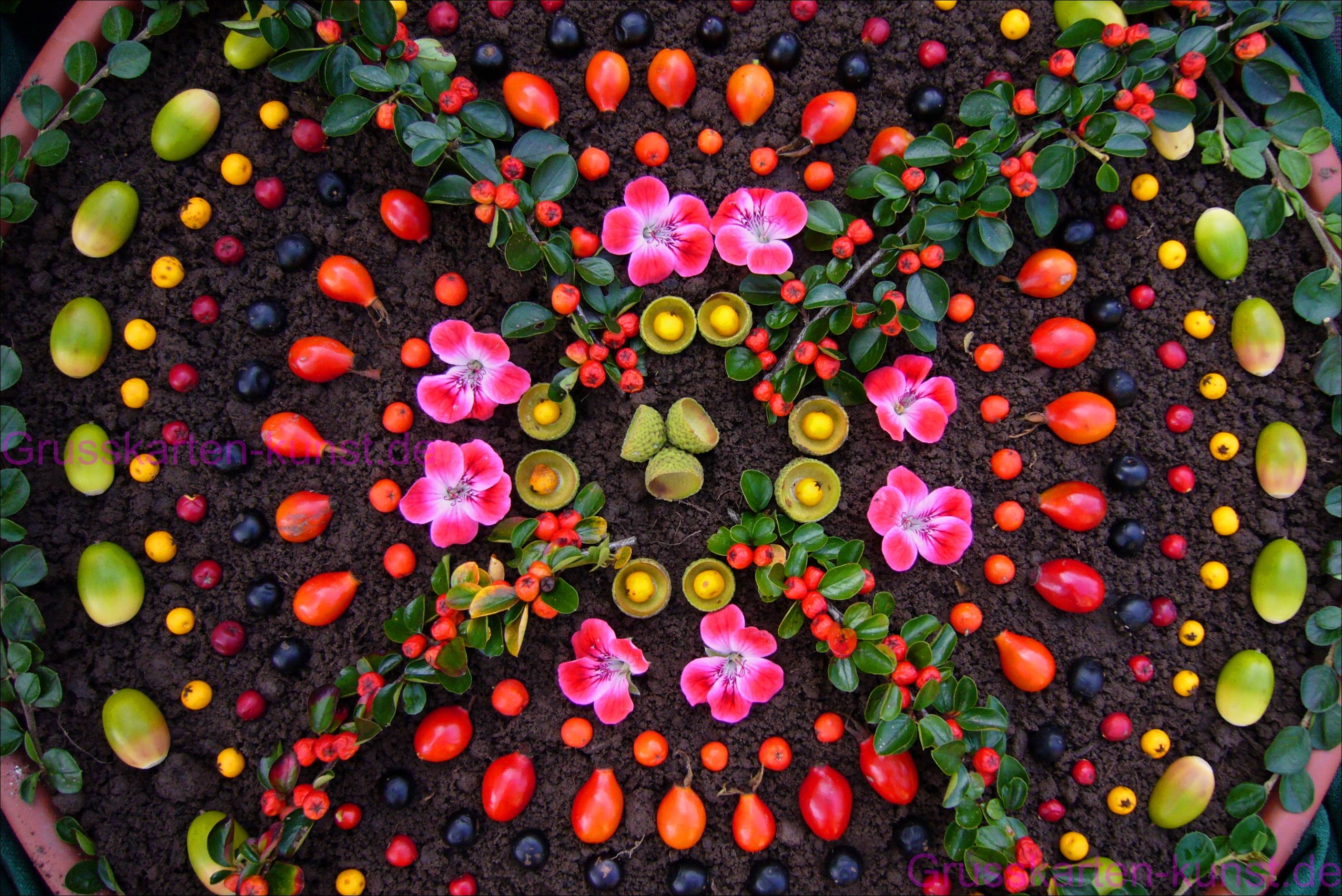 | N10 Dieses Mandala besticht durch seine Farbkontraste. Dunkle Brauntöne, knallige Rot- und Grüntöne hauen einen fast um. In der Mitte liegt eine grüne drillings Eichelschale, die von 8 als Schalen, kreisrund aufgestellten Eichelschalen, die mit gelben, runden Sanddornfrüchten gefüllt sind, umgeben ist. Die nun immer größer werdenden Kreisformen werden durch 4 diagonal gelegte Kriechmispelzweige mit grünen Blättchen und roten Früchten durchbrochen. Weitere Kreise bilden 8 pink-weiße Geranienblüten, orangene Ebereschenfrüchte, rotorangene Wildrosen- hagebutten, schwarze Vogelbeeren, Früchte des Rotdorns, gelbe Ebereschenfrüchte und ein Kreis aus frischen, grünen Eicheln. Alles liegt auf sattbrauner Muttererde. Farbige, geometrische Bombe. Mail mit der Karte N10 versenden Karte N10 vergrößern | |