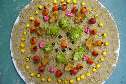 | N11 Ähnlich wie Mandala 1,2 und 6 hat hier ein Kind mit Früchten auf einem sandigen Teller gearbeitet. Hier liegen außen gelbe Sanddornfrüchte und nach innen hin rote Wildrosenhagebutten, Hülsen der Bucheckern, rosa Pfaffenhütchen, grüne, Tannenzapfenähnliche blättrige Blüten?, schwarze Vogelbeeren und ganz innen erneut eine orangerote Hagebutte. Einfach nett! Mail mit der Karte N11 versenden Karte N11 vergrößern | |