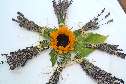 | N12 Unspektakulär. Eine Sonnenblumenblüte in der Mitte, darum 7 mit Bastschleife zusammenge-bundene Lavendelblütensträuße drapiert. Alles auf weißem Hintergrund. Sommer eben ! Mail mit der Karte N12 versenden Karte N12 vergrößern | |