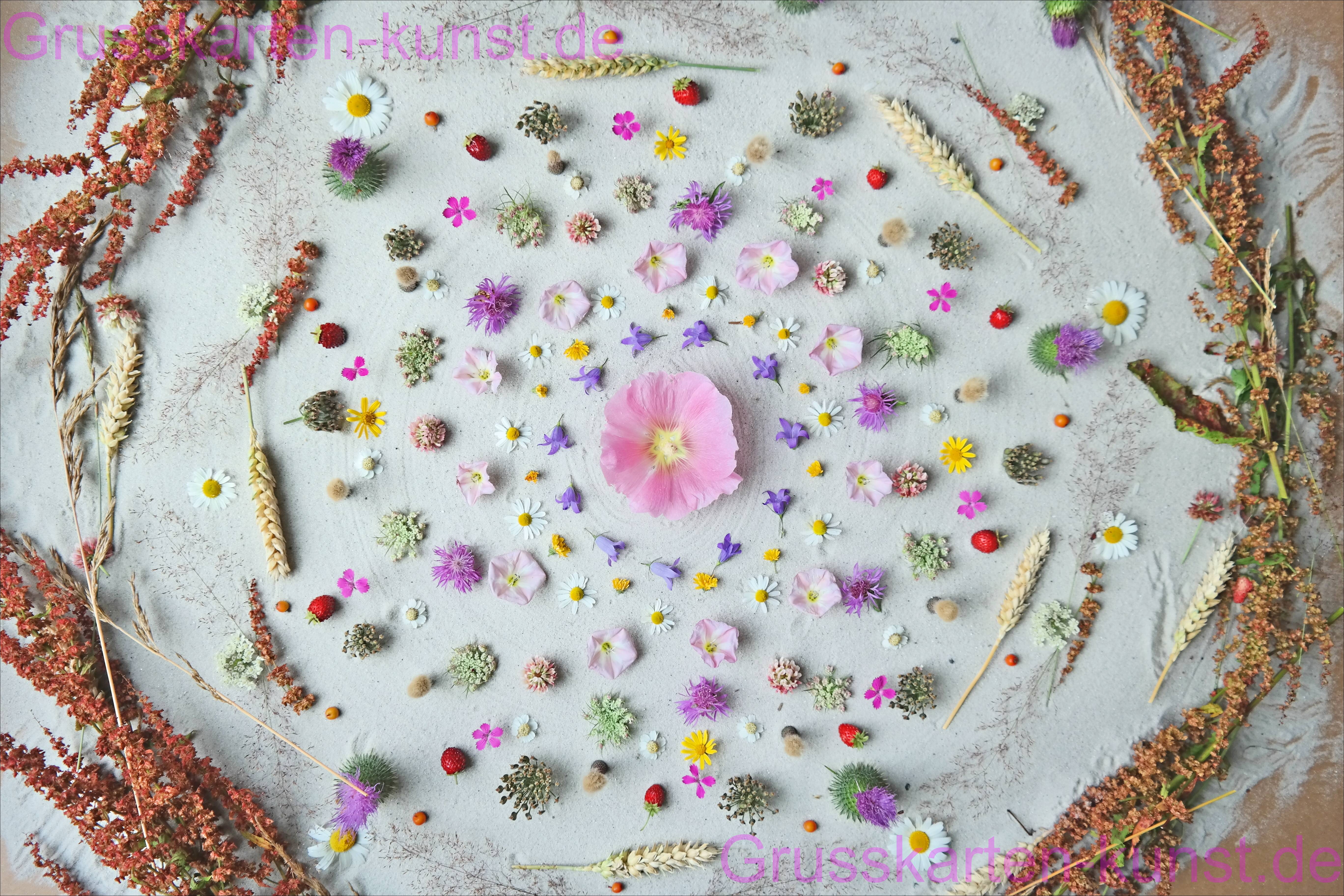 | N13 Wildwiesenblumen- Mandala mit Pfiff. In der Mitte liegt eine pastellrosafarbene Stockrosenblüte. Darum drapierten wir in immer größer werdenden Kreisen verschiedenste Wiesenblüren in den Farben Lila, Pink, Gelb, Zartrosa, Weiß, Rost und Orangefarben, Weizengelb und Erdbeerrot... Eine sehr filigrane Arbeit gelegt und gesteckt in hellem Sand. Wer kann helfen, die Blüten zu bestimmen? Bisher haben wir: Wilderdbeere, Kamille, roter Klee, Schlüsselblume, Schafgarbe, Weizen, trockener Sauerampfer, Distel, Wiesenstaubwedel.... Viel Arbeit, viel Entspannung, feiner Duft und was für Ihre Augen! Mail mit der Karte N13 versenden Karte N13 vergrößern | |
