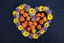 | Y03 Ein Herz aus Stroh, gespickt mit lila Astern- und gelben Ringelblumenblüten. In der Mitte liegen Lampignonfrüchte. Alles auf schwarzem Untergrund. Mail mit der Karte Y03 versenden Karte Y03 vergrößern | |