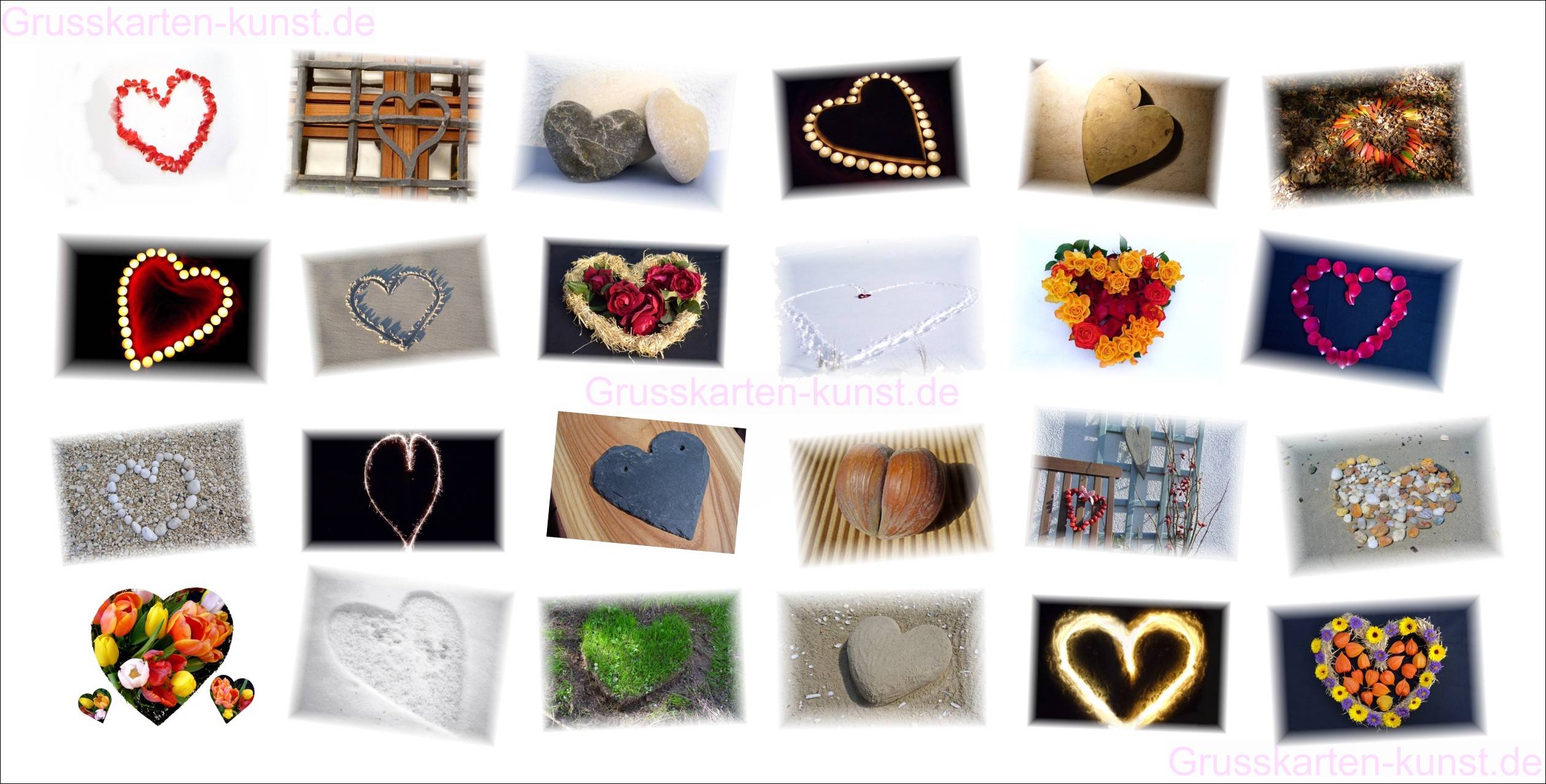 | Y24** 4 Reihen mit je 6 Herzmotiven, alle selbst gefunden oder selbst gelegt. Alle Karten, die oben beschrieben stehen. Im Dez. 2011 als Adventskalender benutzt. Din A6 lang- Karte Mail mit der Karte Y24 versenden Karte Y24 vergrößern | ![]() |
