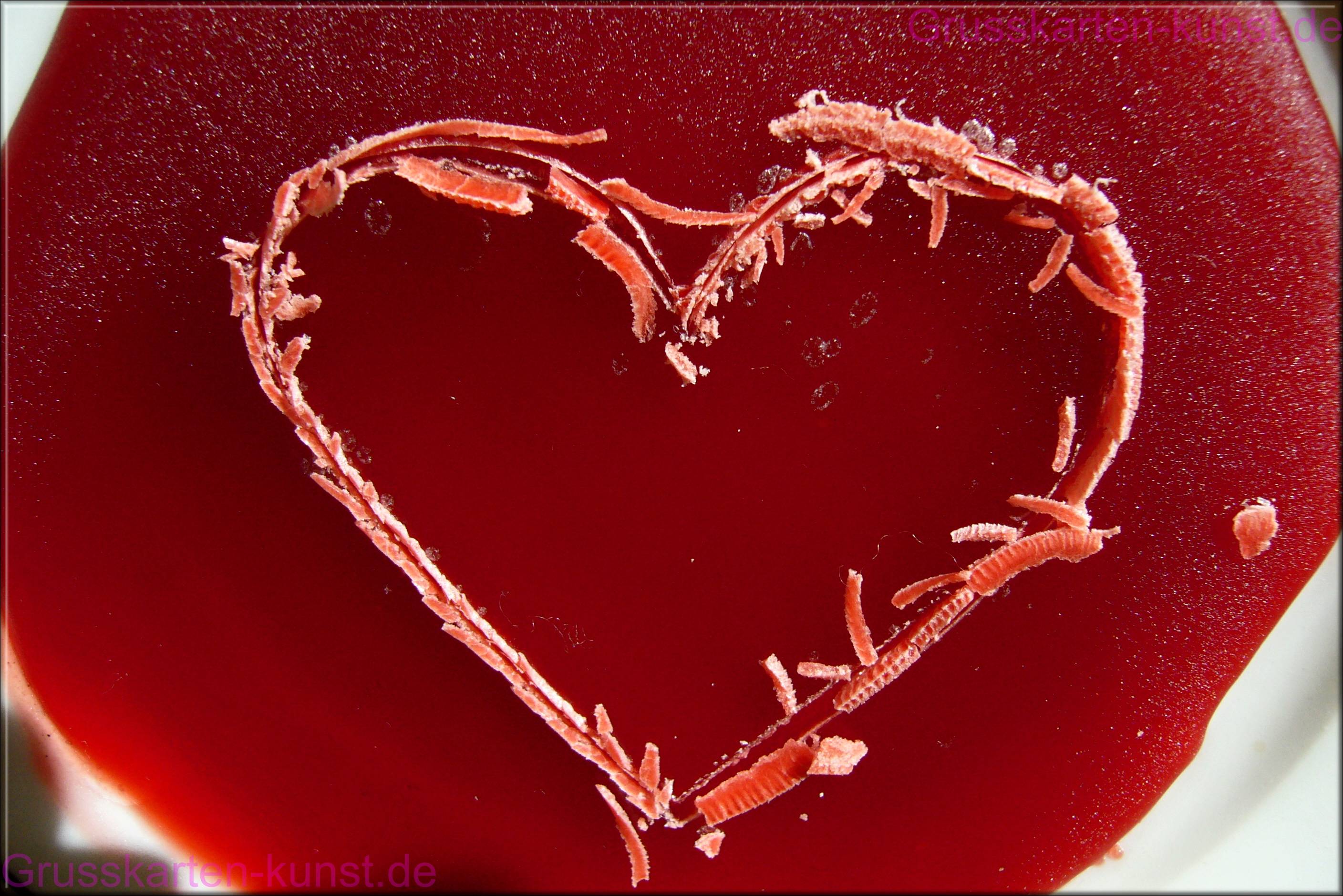 | Y27 Ein Herz in den roten Wachs gekratzt. Wachsspäne lbilden die flockige Linie. Flüssiger Wachs wurde auf eine Unterlage gegossen. Nach dem Erkalten kratzte ich mit einer Nadel ein Herz in die Fläche. Ob es soetwas schon gibt ? Mail mit der Karte Y27 versenden Karte Y27 vergrößern | ![]() |
