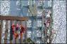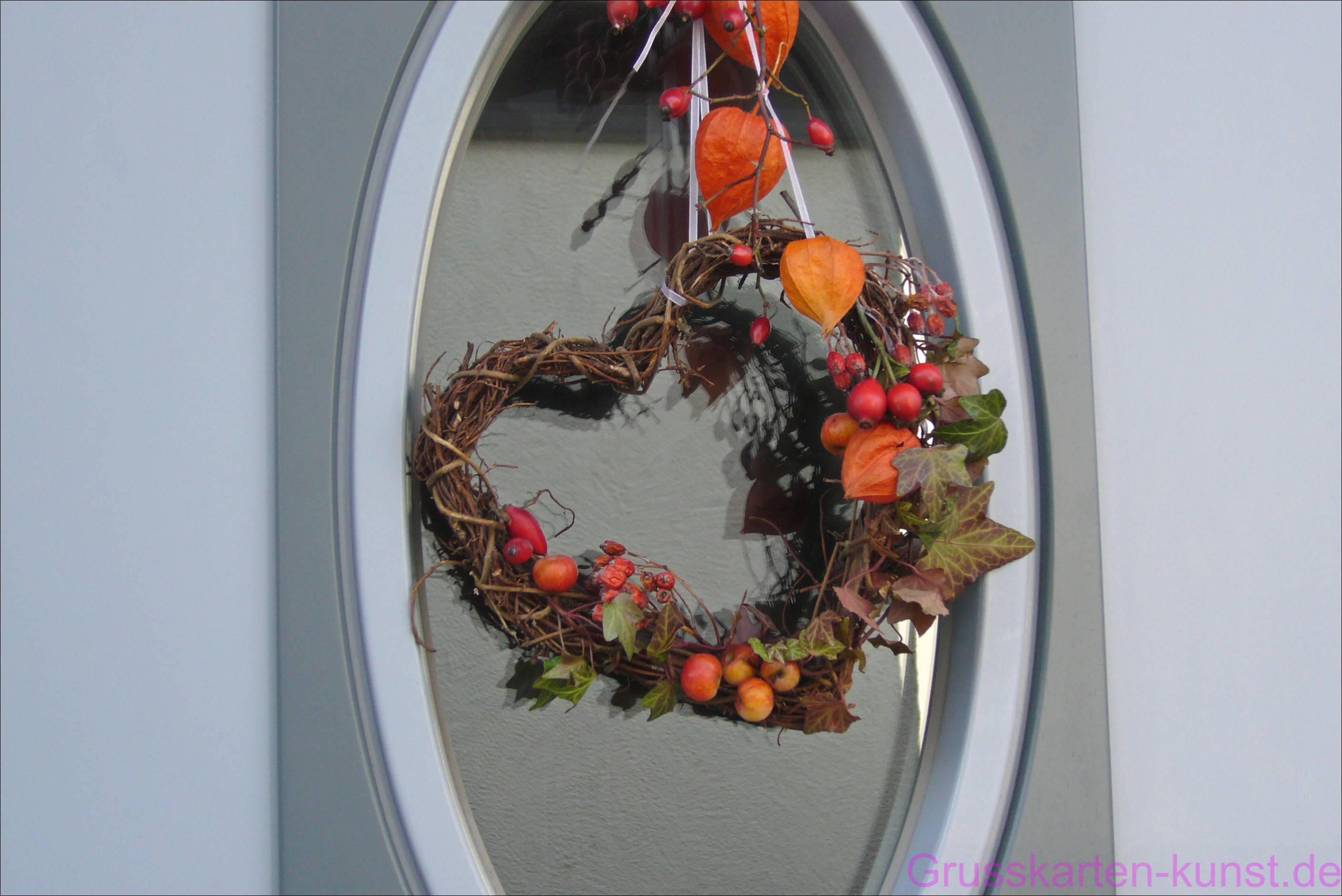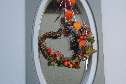 | Y30 Hier wurde ein Herz aus mit Zweigen umwickeltem Draht geformt und mit herbstlichen roten, orangenen und grünen Früchten, wie Zierapfel, Hagebutte oder Efeu dekoriert. Mit einem hellen Faden, an dem auch orangene Lampionfrüchte gebunden sind, wurde dieses Herz etwas schräg in einen ovalen Türausschnitt mit Glas gehängt. Verschiedene Grautöne der Tür bieten einen Kontrast. Mail mit der Karte Y30 versenden Karte Y30 vergrößern | |