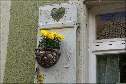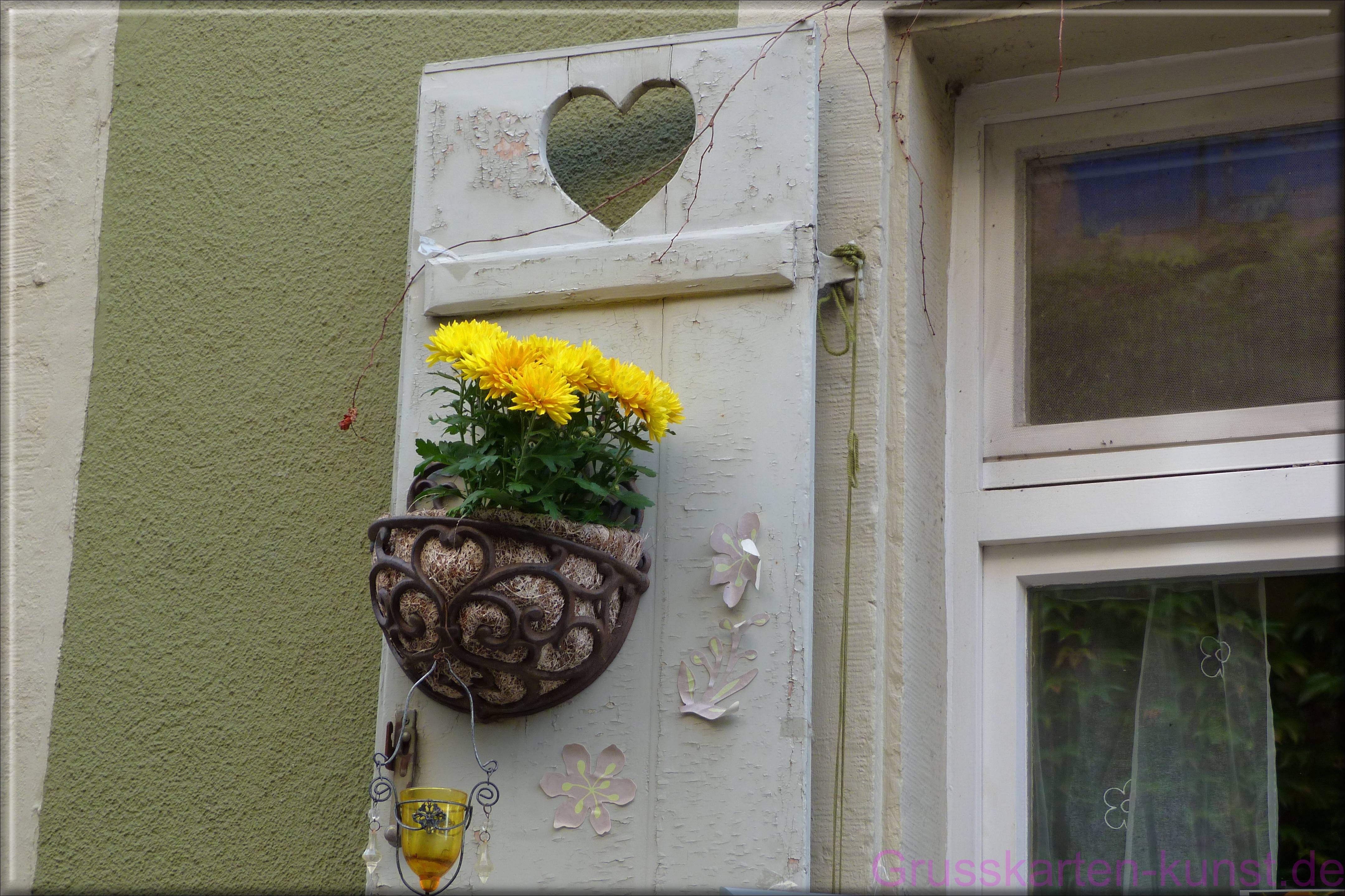 | Y32 Ausschnitt einer geöffneten , alten, kittfarbenen Fensterlade in deren obern Hälfte ein Herz aus dem Holz geschnitten wurde. Unter diesem Herz wurde ein Blumentopf gehängt in dem gelbe Crysanthemen blühen. Eine moosgrüne Wand bildet den Hintergrund. Frisch. Mail mit der Karte Y32 versenden Karte Y32 vergrößern | |