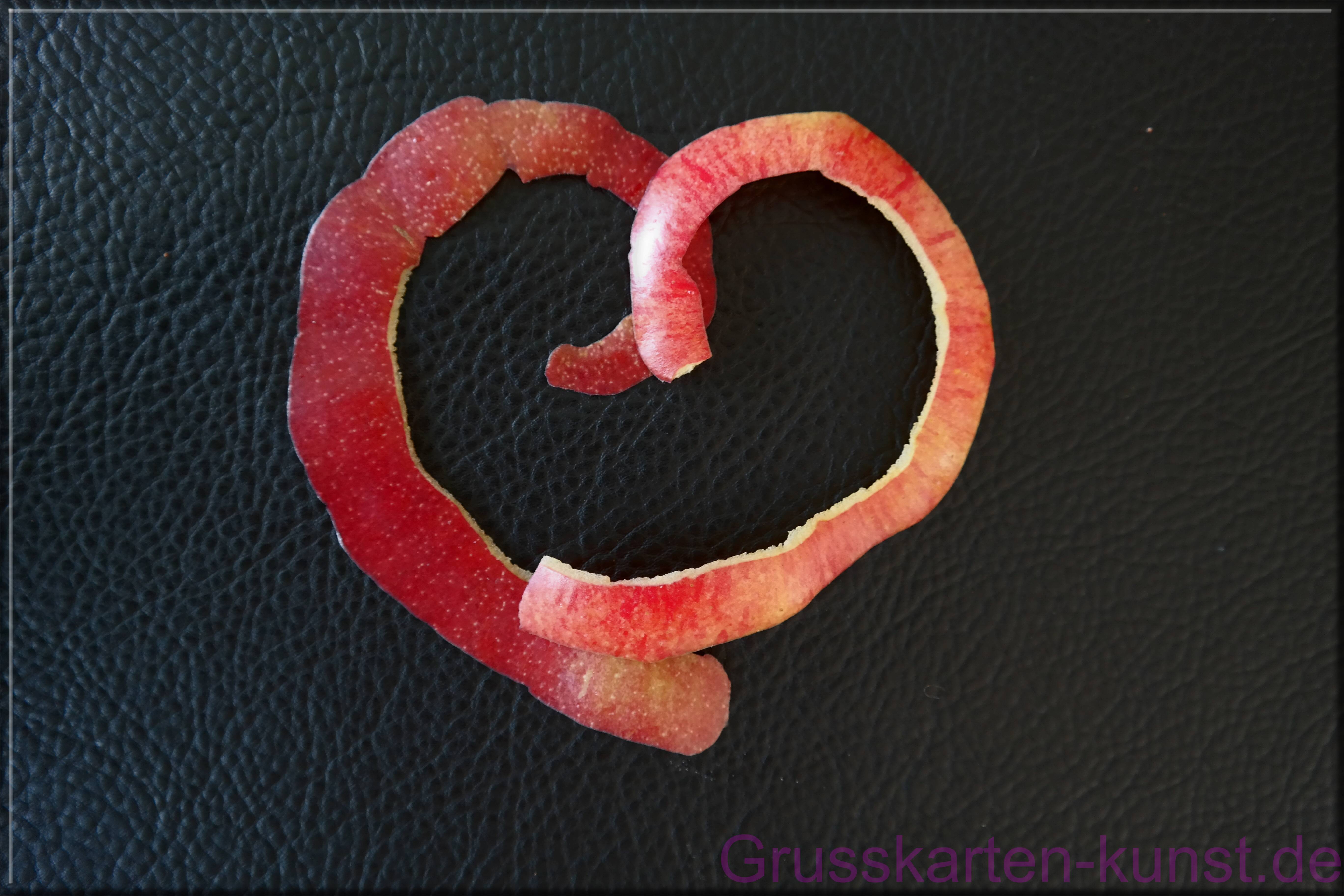 | Y33 Rot(gelb) auf schwarz: Schälmesser genommen, Apfel im Kreis herum geschält. Zwei sich kringelnde Schalenstücke so zusammen gelegt, dass ein Herz entsteht. Auf einer Platte, Brett, Teller oder wie hier auf dunklem Leder dekoriert und freuen lassen. Dabei Apfel essen und grinsen. Mail mit der Karte Y33 versenden Karte Y33 vergrößern | |