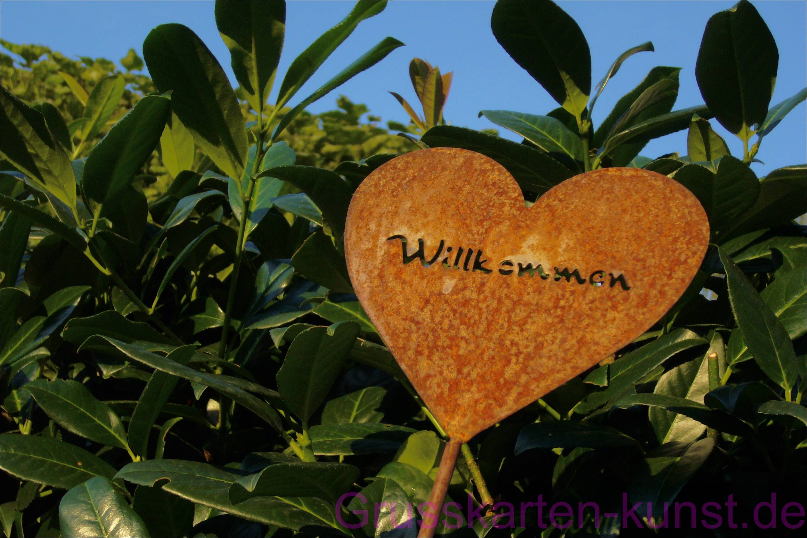 | Y34 "Willkommen" steht in ein metallisches, von Rostpatina überzogenes Metallherz gefräst. Das Herz steht auf einem dünnen Metallstab in der Erde vor einer grünen Kirschloorbeerhecke. Im Hintergrund leuchtet der blaue Himmel. Schlicht, nett und mit dem Spruch " Ich würd`gern mit dir Frühstücken, darf ich dich zum Abendessen einladen" sicher ein echter Knaller. Mail mit der Karte Y34 versenden Karte Y34 vergrößern | |