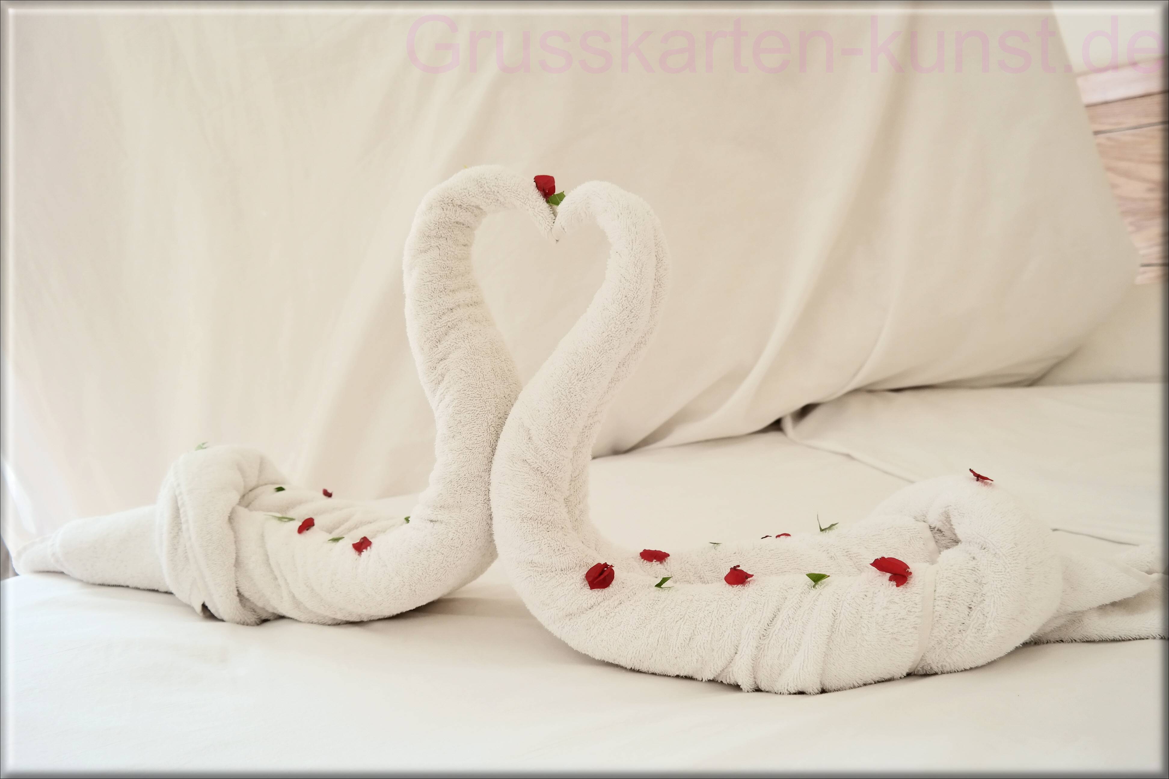 | Y35 Zwei Schwäne stehen sich gegenüber. Die gebogenen Hälse bilden zusammen mit den Schnäbeln ein Herz. Aus 2 Handtüchern wurden diese Schwäne "gedreht" und geformt. Sie saßen auf unserem Hotelbett. Alles in weiß gehalten. Mit einigen Blütenblättern auf den Schwänen bekommt das Paar eine verspielt süßliche Note. So sollte man seinen Schatz öfter beglücken. Mail mit der Karte Y35 versenden Karte Y35 vergrößern | |