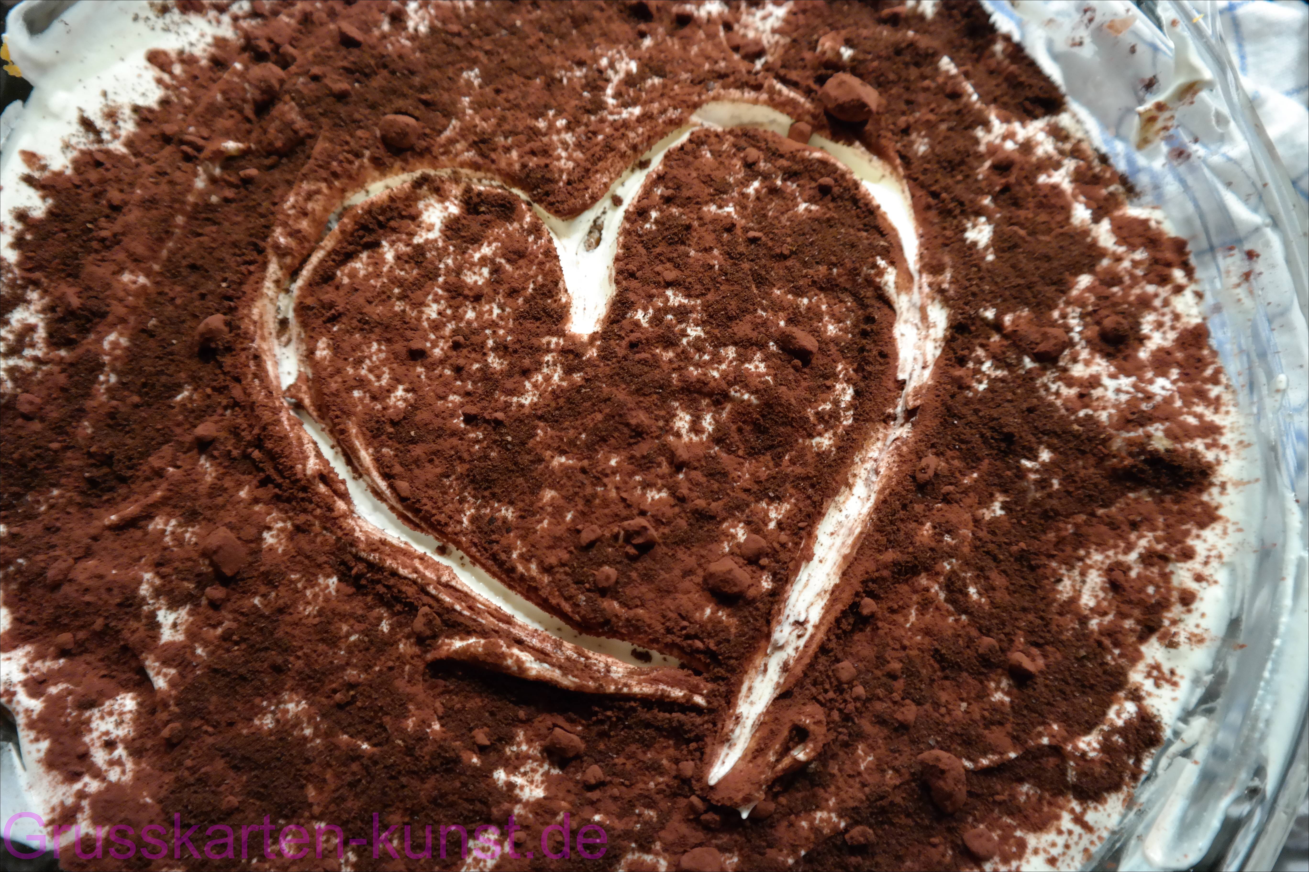 | Y37 Herz im Tiramisu: In einer runden Schüssel wurde ein Tiramisu angerichtet. Auf die oberste weiße Mascaponeschicht wird Kaffee und Kakaopulver gestreut. Mit dem Stil eines Löffels habe ich ein Herz in diese braune Schicht gemalt. So kommt das weiße zum Vorschein. Süße Verführung. Mail mit der Karte Y37 versenden Karte Y37 vergrößern | |
