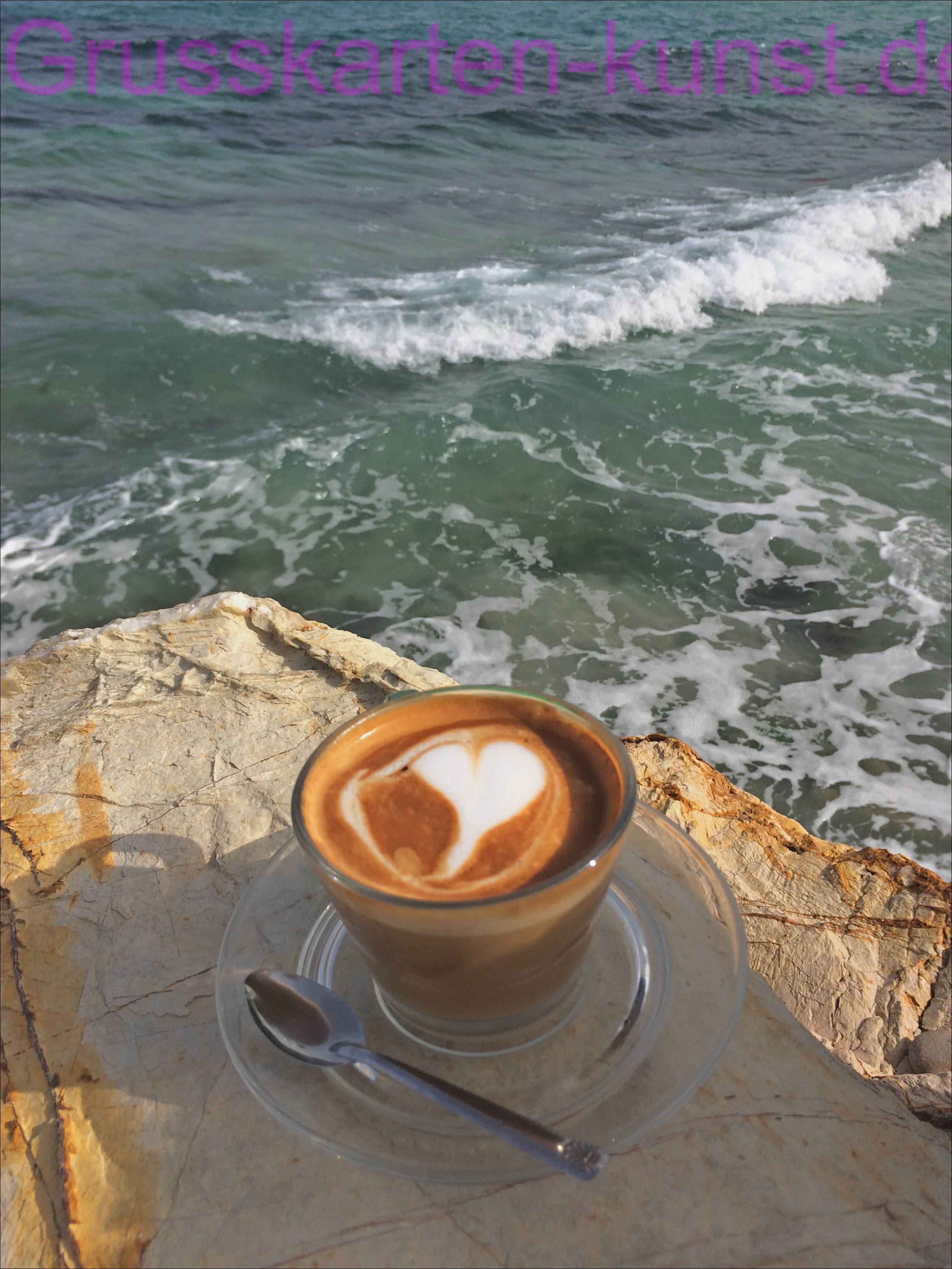 | Y38 Auf einem sandfarbenen Felsen steht in einer Glastasse auf einem Glasuntersetzer eine Tasse Cappucino. Der Milchschaum wurde wie ein weißes Herz in den moccafarbenen Kaffee gezeichnet. Im Hintergrund plätschert und rauscht das Türkiesgrüne Meer mit einer Schaumkrone an die Felsen heran. Endlich wieder draußen sitzen, möchte man sagen... Mail mit der Karte Y38 versenden Y38 vergrößern | |