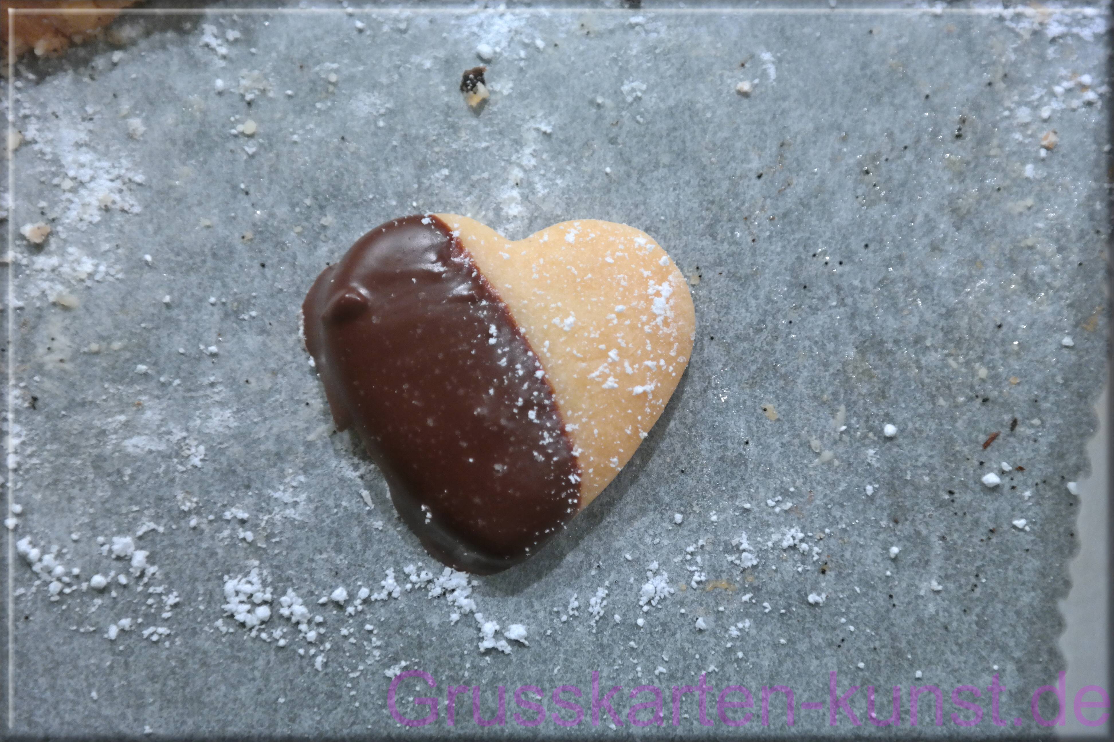 | Y39 Ein Herz aus Mürbeteig gebacken und zur Hälfte mit Schokoglasur überzogen liegt auf einer mit Vanillezucker gepuderten grau-blauen Arbeitsplatte. Einfach zum Anbeißen. Erste Plätzchen zusammen mit Enkelkind gebacken. Mail mit der Karte Y39 versenden Karte Y39 vergrößern | |