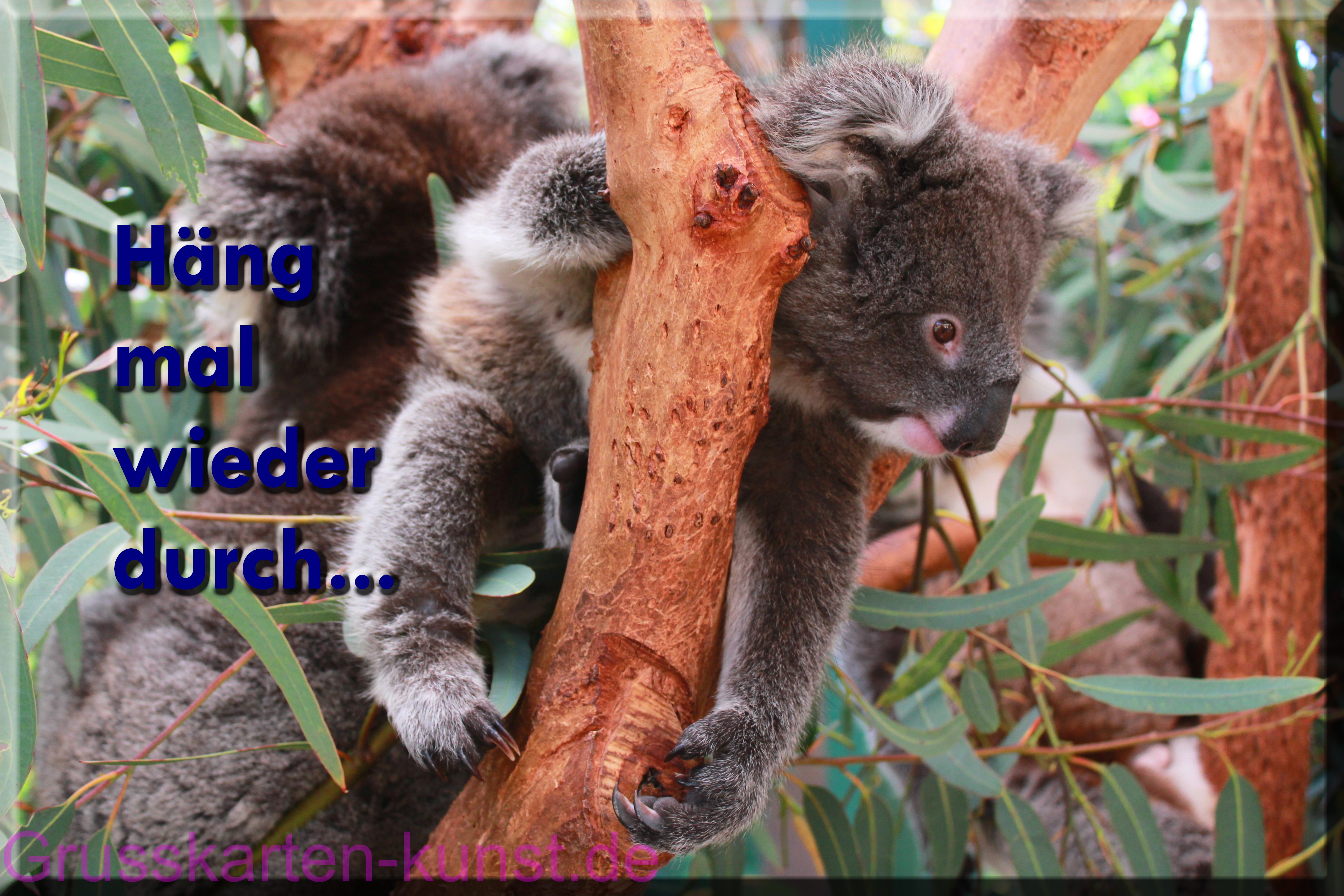 E01 "Häng mal wieder durch..." steht in blauer Druckschrift untereinander am linken Kartenrand. Abgebildet ist ein grau- brauner Koala Bär, der bäuchlings zwischen der Astgabel eines Eukalyptus Baumes hängt. Vorderbeine mit scharfen Krallen hängen links und rechts des einen Astes herab. Die rötlich-weißen Knopfaugen schauen teilnahmslos in Richtung rechter, unterer Bildecke. Drumherum ist Blattwerk zu sehen. Zweideutig verwendbar. | ||