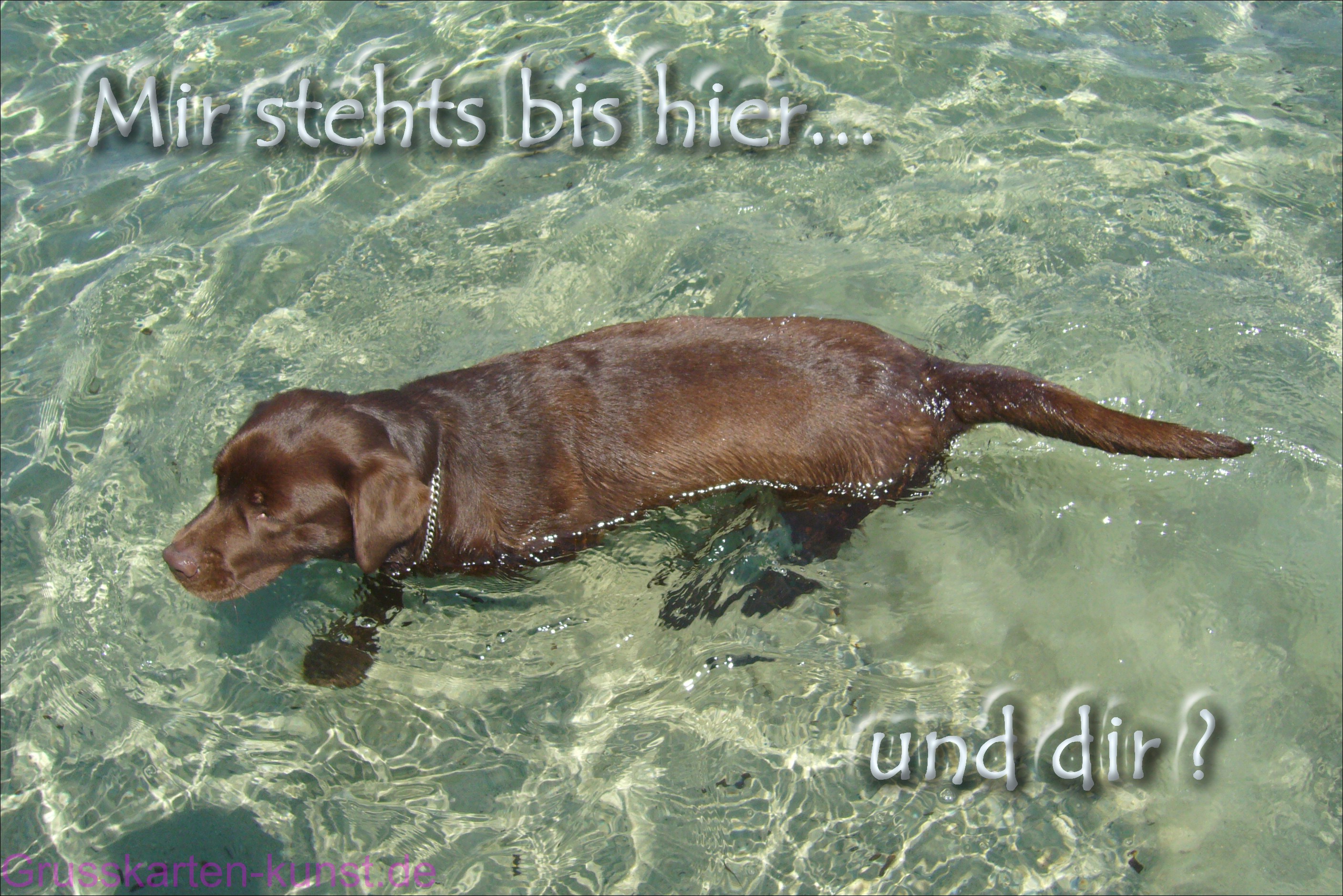 | E05 „Mir steht`s bis hier…und dir ?“ steht in wässrig weißer Schrift oben und unten auf der Karte. Zu sehen ist unser brauner Labrador, der sich in glasklarem Wasser, das bis zum Hals steht, eine Abkühlung verschafft. Die seichten Bewegungen des Wassers sorgen mit der Sonne dafür, dass eine glitzernde, weiche Hintergrundstruktur entsteht. Mail mit der Karte E05versenden Karte E05 vergrößern | | |