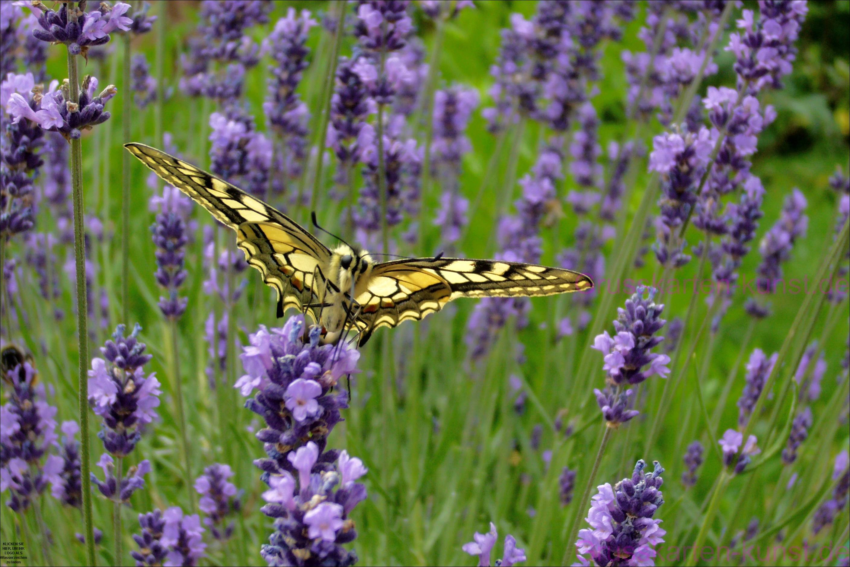 | E06 ** Glückstreffer! bestimmt 40 mal versuchte ich diesen Schwalbenschwanz, der ständig in Bewegung war, auf unserem Lavendel zu erwischen. Hier sitzt er mit ausgebreiteten Flügeln auf einer Blüte und scheint uns vis a vis anzugucken. Die gelblichen Flügel sind von dunklen Mustern durchzogen. Man sieht die wellenförmigen Flügelränder und auch zart lila Punkte, wie beim Pfauenauge. Der Hintergrund verschwimmt in grün und Lila, wie ein Lavendelfels. Karte ohne Spruch, aber man könnte sagen: nicht abheben ! ... verleiht Flügel.... Überflieger... Wortspielerei Vorrätig mit dem Spruch "Viel Glück" Mail mit der Karte E06versenden Karte E06 vergrößern | | |