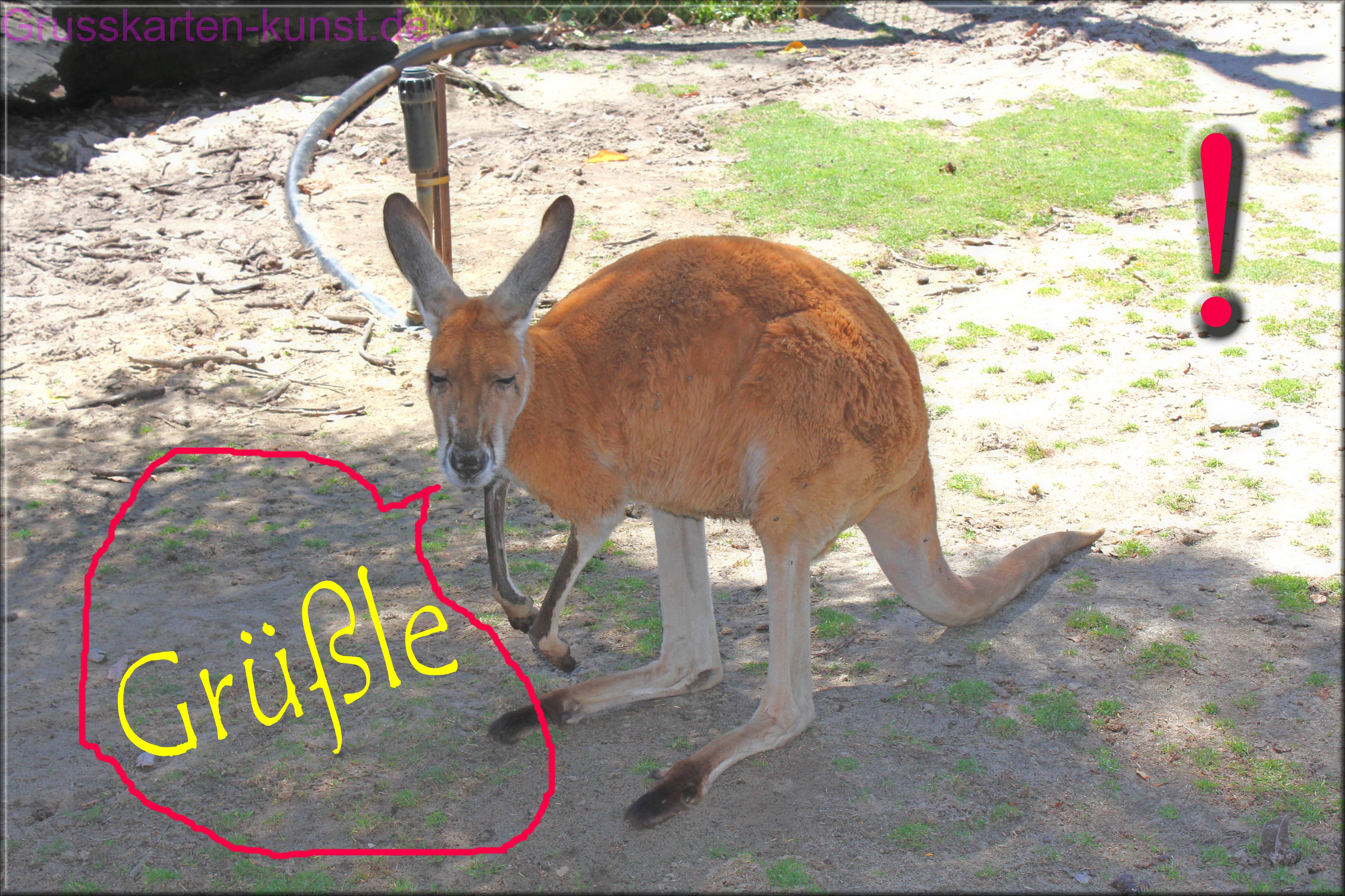 | E08 "Grüßle" steht gelb in einer Sprechblase geschrieben. Diesen Ausspruch hat das beige- braune Känguruh, mit hochstehenden Ohren und gebückt auf zwei Beinen stehend, getätigt. Manchmal muss man eben schwäbisch sparsam sein.... Mail mit der Karte E08versenden Karte E08 vergrößern | | |