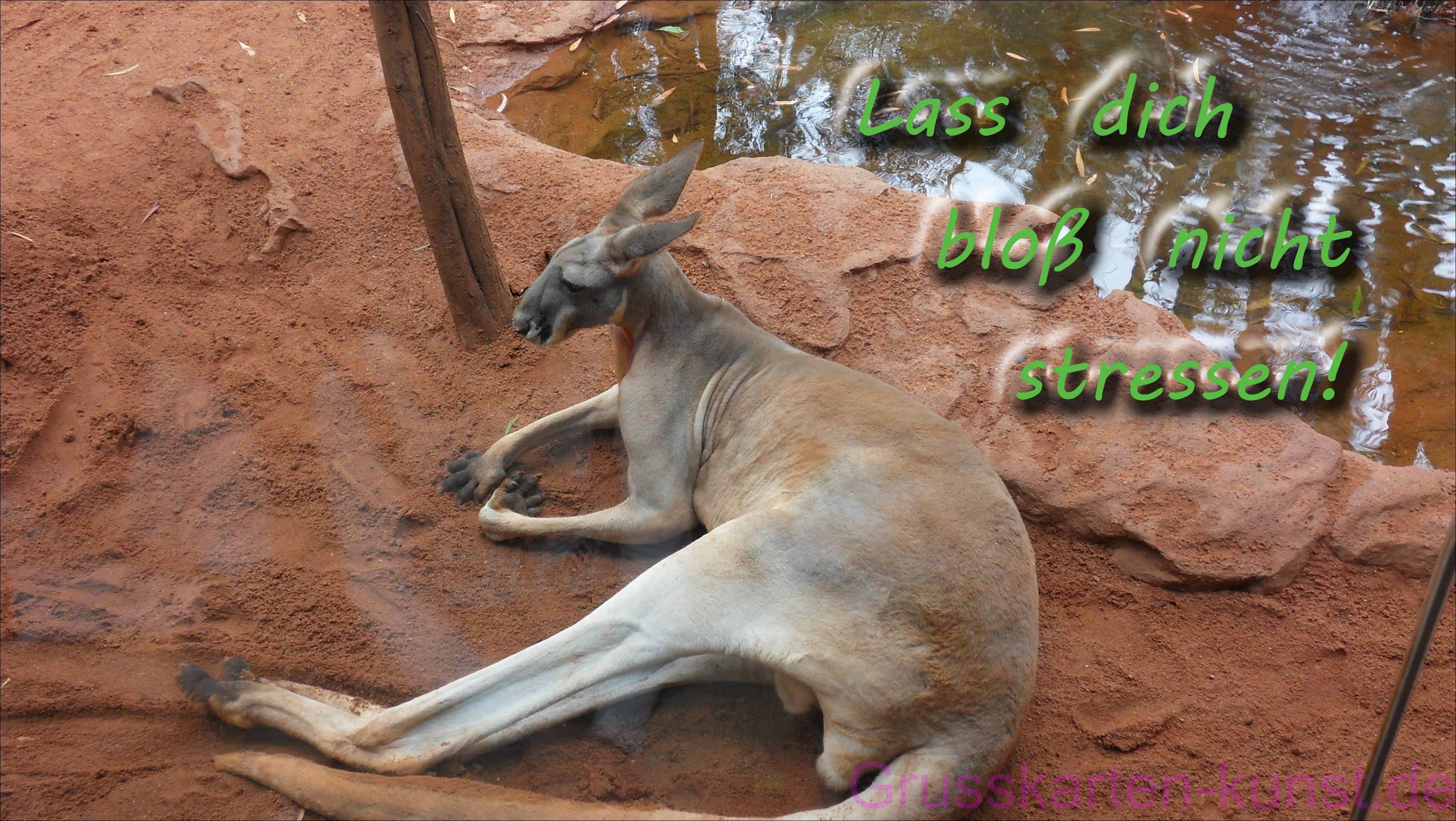 | E 12 "Lass dich bloß nicht stressen" steht in grüner Schrift auf dem Wasserspiegel eines Tümpels, vor dem ein Känguruh, die Beine ausstreckend liegt und recht gleichgültig drein schaut. Interessanter Anblick eines hier eher selten zu sehenden Tieres. (Foto:J. Cremer, Australien) Mail mit der Karte E12versenden Karte E12 vergrößern | | |