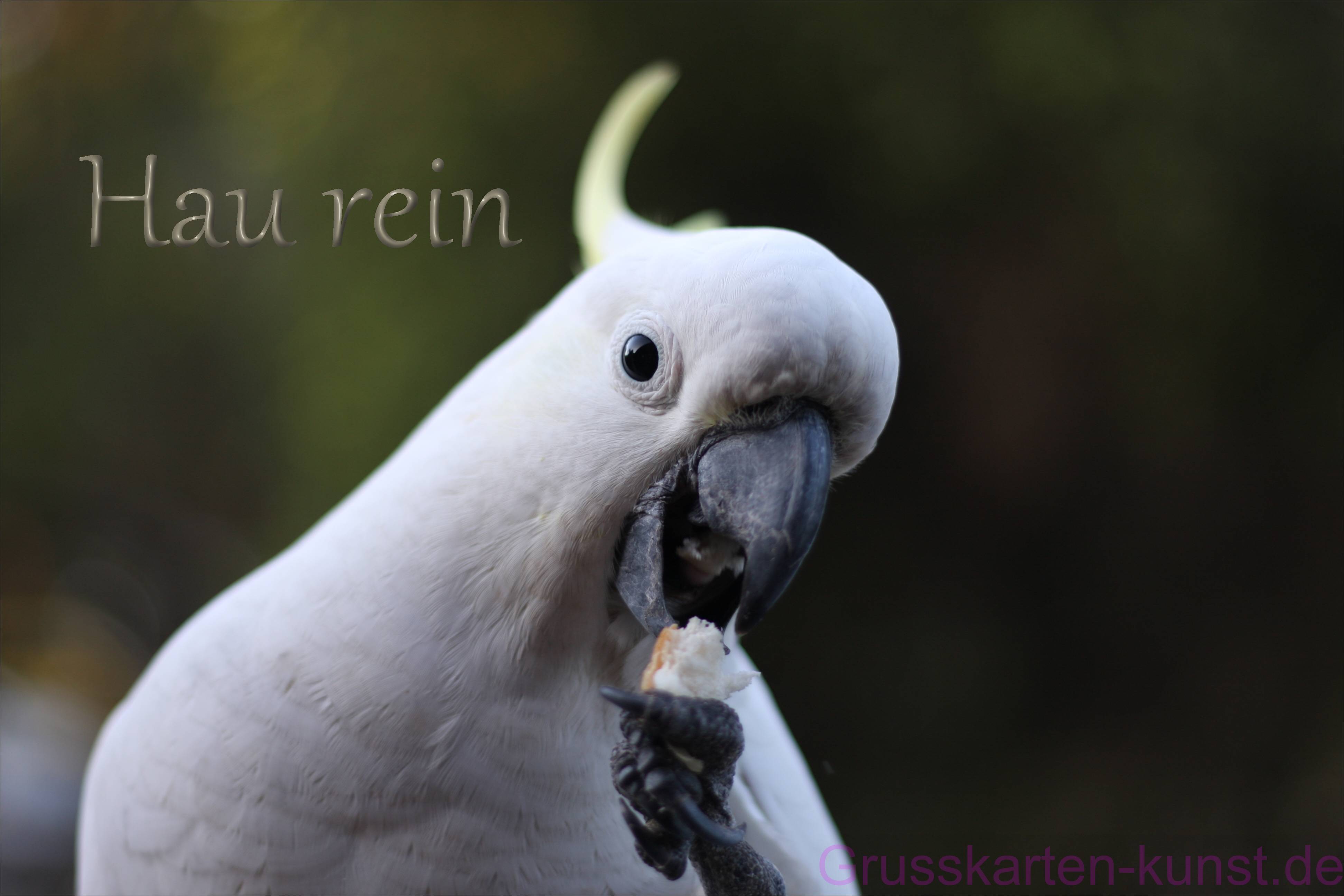 | E13 "Hau rein" Ein weißer Papagei von Brust bis Kopf mit einem gelblichen, zipfeligen Kamm schaut mit einem leicht zur Seite geneigten Kopf den Betrachter an. In den leicht geöffneten dunklen Schnabel manövriert er mit seiner Kralle ein Stück Brot. Der Schriftzug steht oben links vor einem insgesamt dunkelgrünen, verschwommenen Hintergrund. Zweideutig? Mail mit der Karte E13versenden Karte E13 vergrößern | ![]() | |