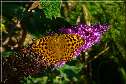 | E15 Dieser Edelfalter mit kupfergoldfarbigem Kleid, schwarzen Flecken und leicht grün schimmerndem Körper und perlmuttfarbigem Flügelrand sitzt mit ausgebreiteten Flügeln auf der violetten Rispe eines Schmetterlingsstrauches. Der in verschiedenen Grüntönen schimmernde Hintergrund aus Blättern bildet einen schönen Rahmen und lässt die wie ein V auseinander- gehenden Fühler mit ihren orangenen Spitzen deutlich hervortreten. Natur pur. Mail mit der Karte E15versenden Karte E15 vergrößern | | |