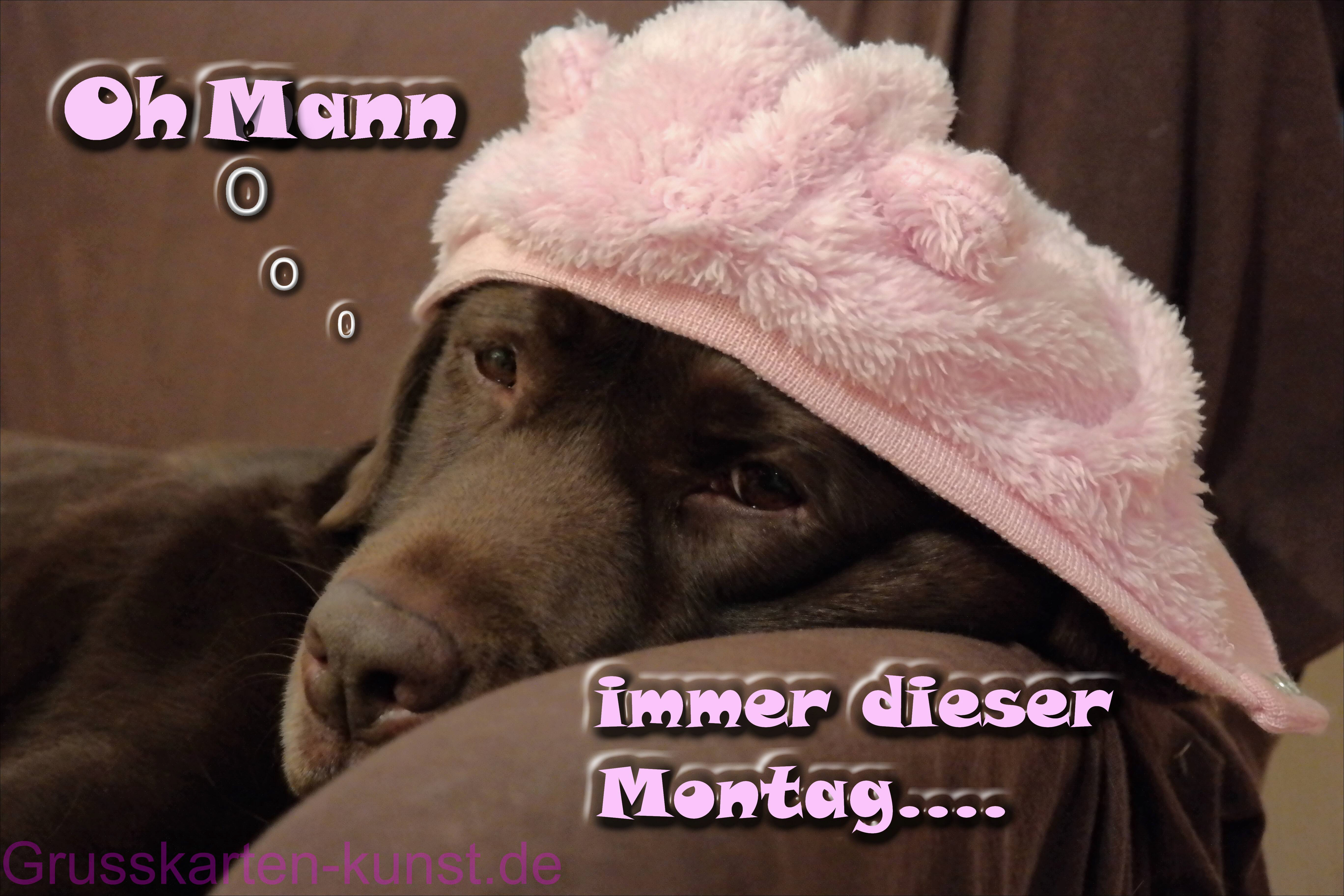 | E18 "Oh Mann.... immer dieser Montag..." steht in rosa Bubblegumschrift auf der Karte, die einen auf einer Sessellehne stützenden Hundekopf zeigt. Der braune Labrador schaut dösend ins Leere, hat eine rosa Plüschmütze mit zwei Öhrchen oben dran auf und eine Denkblase über dem Kopf. Braun- rosa Farbkombination wirkt irgendwie altbacken und müde. Für Montagsmuffel. Mail mit der Karte E18versenden Karte E18 vergrößern | | |