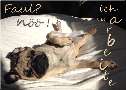 | E19 "Faul? nö! " steht oben links. Am rechten Rand steht klein von oben nach unten geschrieben: "ich ver" und dann groß "arbeite". Ein wenig hinters Licht führend, wenn man oberflächlich schaut und liest. Zu sehen ist eine Mopshündin, die wie ein Korkenzieher gedrecht, halb auf dem Rücken liegend die BHinterläufe ausstreckt und die Vorderbeine seitlich ausstreckt bzw. angewinkelt nach oben hält. Der Kopf liegt Richtung Betrachter, die Hinterläufe vom Betrachter weg. Der helle Mops mit dunklem Gesicht liegt auf einer von der Sonne beschienenen Decke und schläft. Modern: Chillaxen Mail mit der Karte E19versenden Karte E19 vergrößern | | |