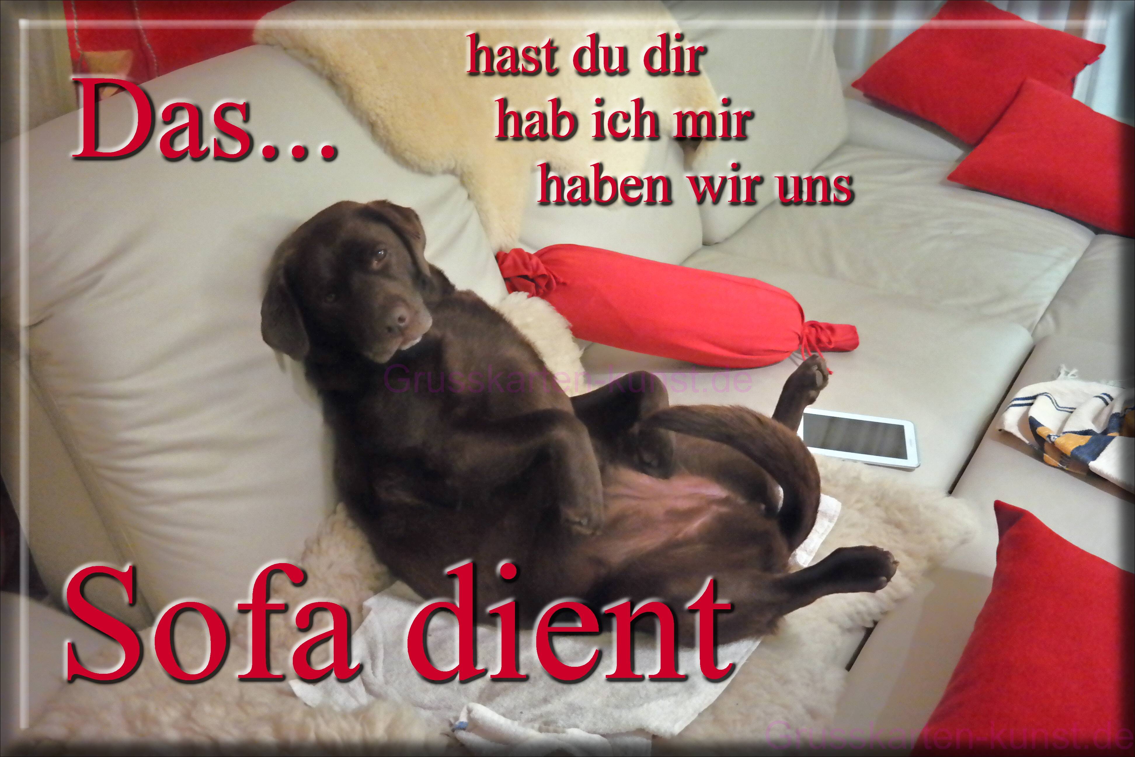 | E22 "Das ... hast du dir - hab` ich mir - haben wir uns SOFA dient" steht in roten Lettern verteilt auf der Karte. Dort "hängt" ein Hund, mit dem Rücken an die Lehne einer hellen Couch gelehnt, die Vorderpfoten lässig nach vorne sackend und das Hinterteil mit Rute, gespreizt auf der Sitzfläche. Rote Kissen ein Schaffell kmplettieren diesen Schnappschuss. Abgefahren entspannt! Mail mit der Karte E22versenden Karte E22 vergrößern | | |