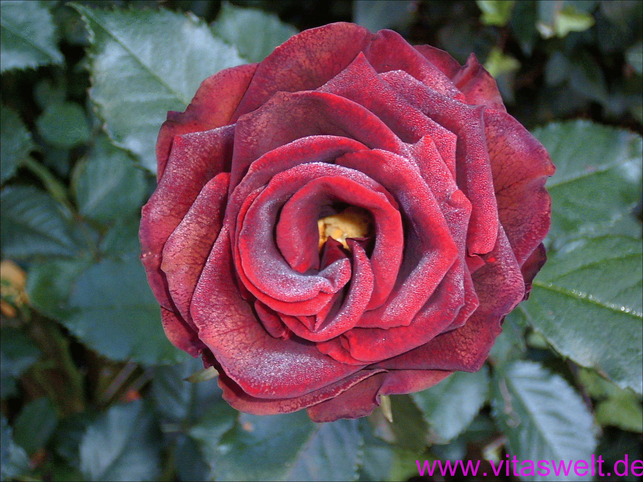 | B22 Selbe Perspektive wie B21, jedoch handelt es sich hierbei um eine herrlich tief dunkelrote Blüte. Die samtweichen Blütenschalen sind nach außen leicht gewellt, ein Wassertröpchen liegt auf einer dieser Welle. Die „Lieblingsrose“ P. Melanchton, leicher, herber Duft. Siehe B01 und H21 Mail mit der Karte B22 versenden Karte B22 bestellen Karte B22 vergrößern | |
