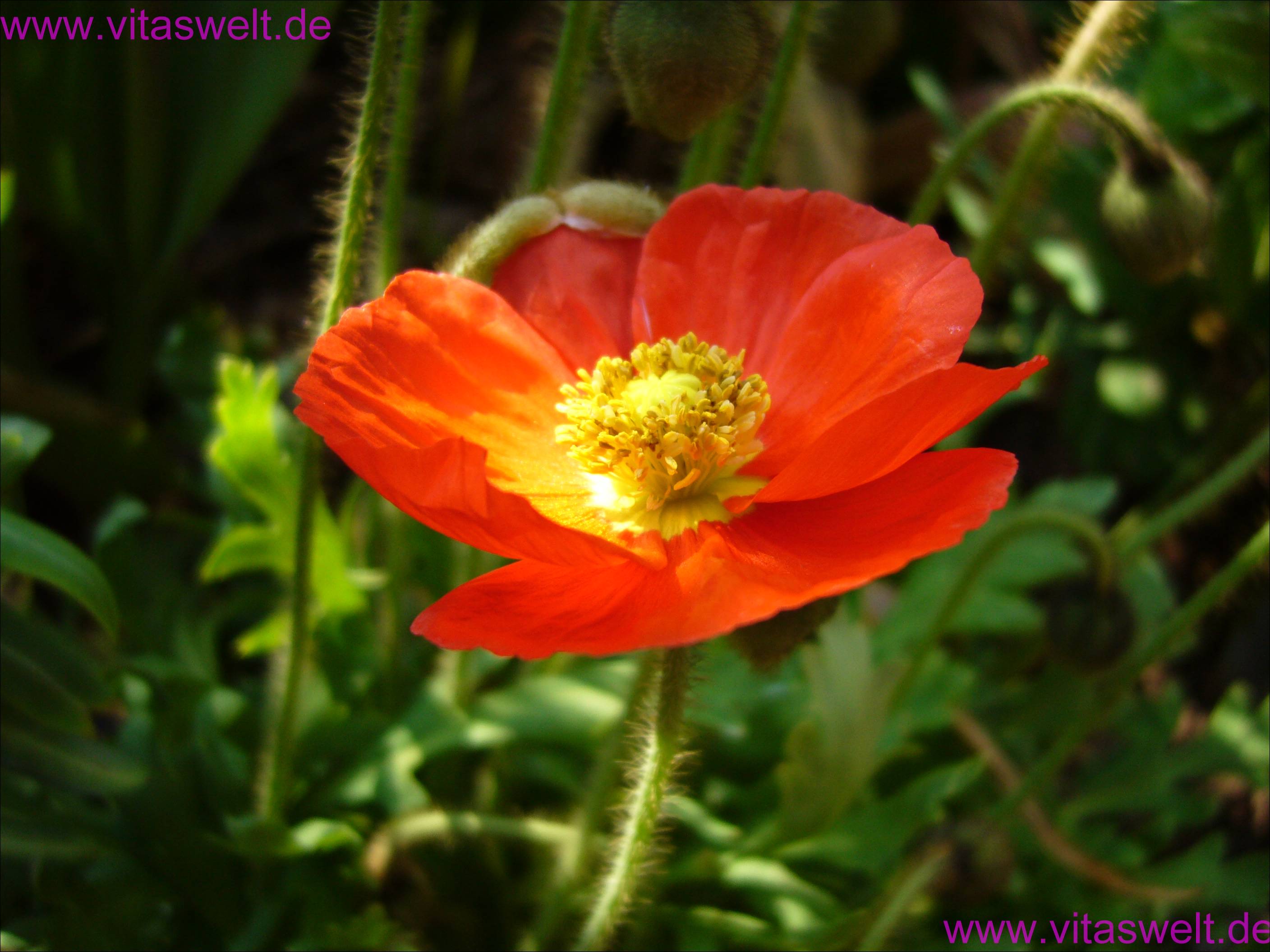 | B13 Nahaufnahme einer Islandmohn Blüte, welche in der Mitte einen gelb geränderten Pollenstempel hat. Die leuchtendrote, offene Blüte leuchtet im Licht der Sonne. Das dünne, behaarte, hellgrüne Stielchen wird von links von der Sonne beschienen. Im sonst grün bis dunkelgrün bewachsenen Hintergrund sticht die Blüte scharf hervor. Herrlich! ohne Text. Karte gibt es auch mit Schriftzug "Lass es Dir gut gehen" **Qualität Mail mit der Karte B13 versenden Karte B13 bestellenKarte B13 vergrößern | |