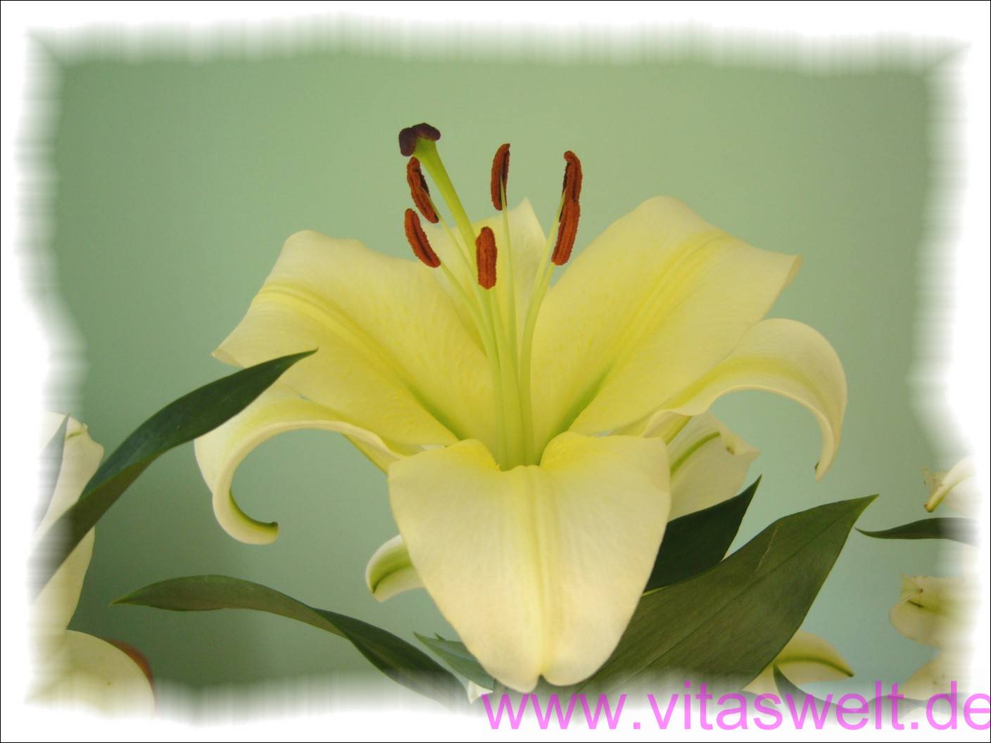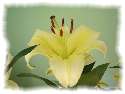 | B14 Eine gelbe Lilienblüte ragt ins Zentrum der Karte. Aus ihrer Mitte ragen die dünnen Stielchen mit den orangefarbenen Pollenstempeln hervor . Unten und links sieht man dunkelgrüne Blätter. Der Hintergrund ist mintgrün und die Karte am gewellten Rand blasser werdend. Wirkt edel. Mail mit der Karte B14 versenden Karte B14 bestellenKarte B14 vergrößern | |