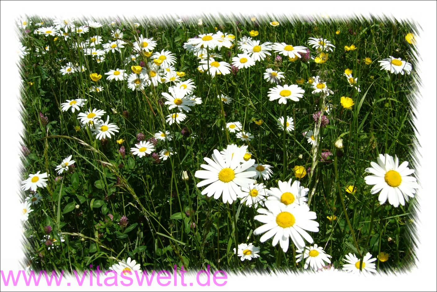 | B15 Die Karte zeigt eine Wiese mit vielen blühenden Margeriten, einigen gelben Butterblumen und etwas rot blühendem Klee. Die Margeriten sind innen gelb und außen mit vielen weißen Blütenblättern. Der Rand der Karte ist fein gestrichelt, wie Grashalme. Zum Reinlegen und Träumen... Mail mit der Karte B15 versenden Karte B15 bestellen Karte B15 vergrößern | |