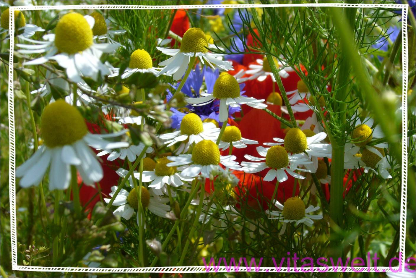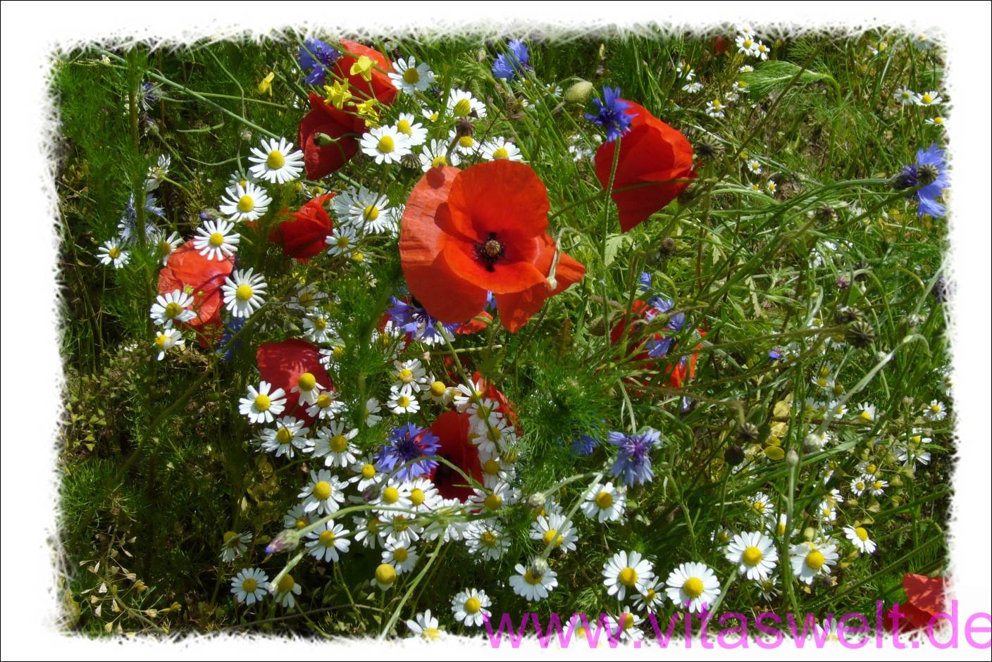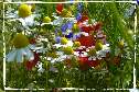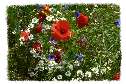 | B16 Fotografie einer Wildblumenwiese im Sonnenschein. Zu sehen sind weiß-gelbe Kamillenblüten, roter Klatschmohn und blaue Kornblumen, sowie eine gelbe Rapsblüte und Gräser. Der Rand ist weiß. Mail mit der Karte B16 versenden Karte B16 bestellen Karte B16 vergrößern | |