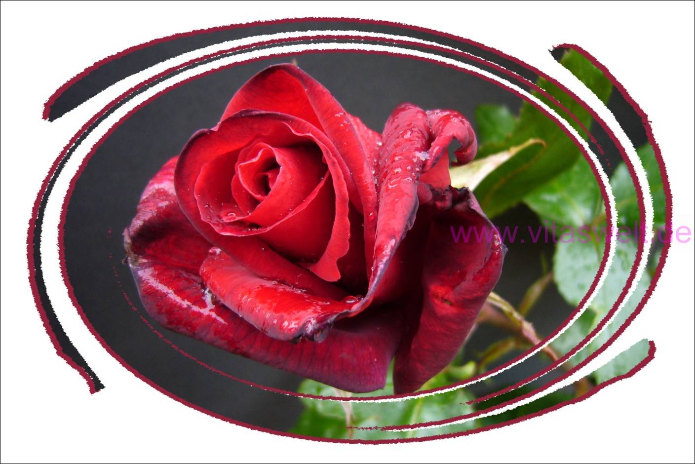 | B19 Eine sich langsam öffnende dunkelrote Rose ragt von rechts unten nach links oben in die Karte hinein. Ein wenig glänzendes Blattlaub hebt, sich samt Blüte, von einem schwarzen Hintergrund ab. Nur die äußeren Blütenblätter wellen sich schon nach außen. Ein leichter Glanz entsteht durch z.T. nasse Blätter. Spiralförmig ausgeschnittenes, ovales Motiv auf weißem Grund. Edel. Mail mit der Karte B19 versenden Karte B19 bestellen Karte B19 vergrößern | |