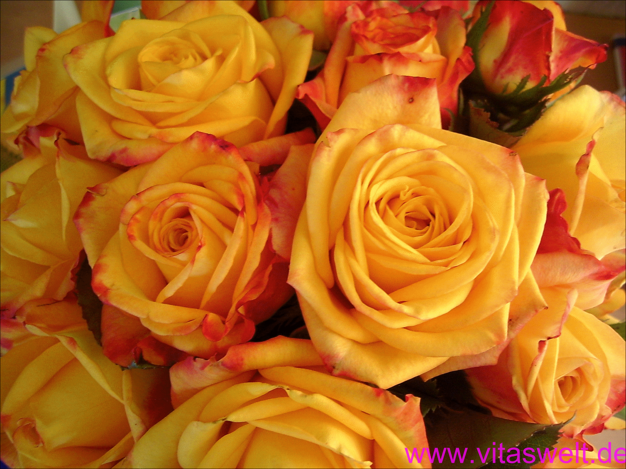 | B02** Goldgelbe Rosen, halboffen mit purpurrotem Rand (Straußansicht von oben, Bild mit über 10 Blüten,voll ausgefüllter Bildausschnitt.) Mail mit der Karte B02 versenden Karte B02 bestellen Karte B02 vergrößern | |