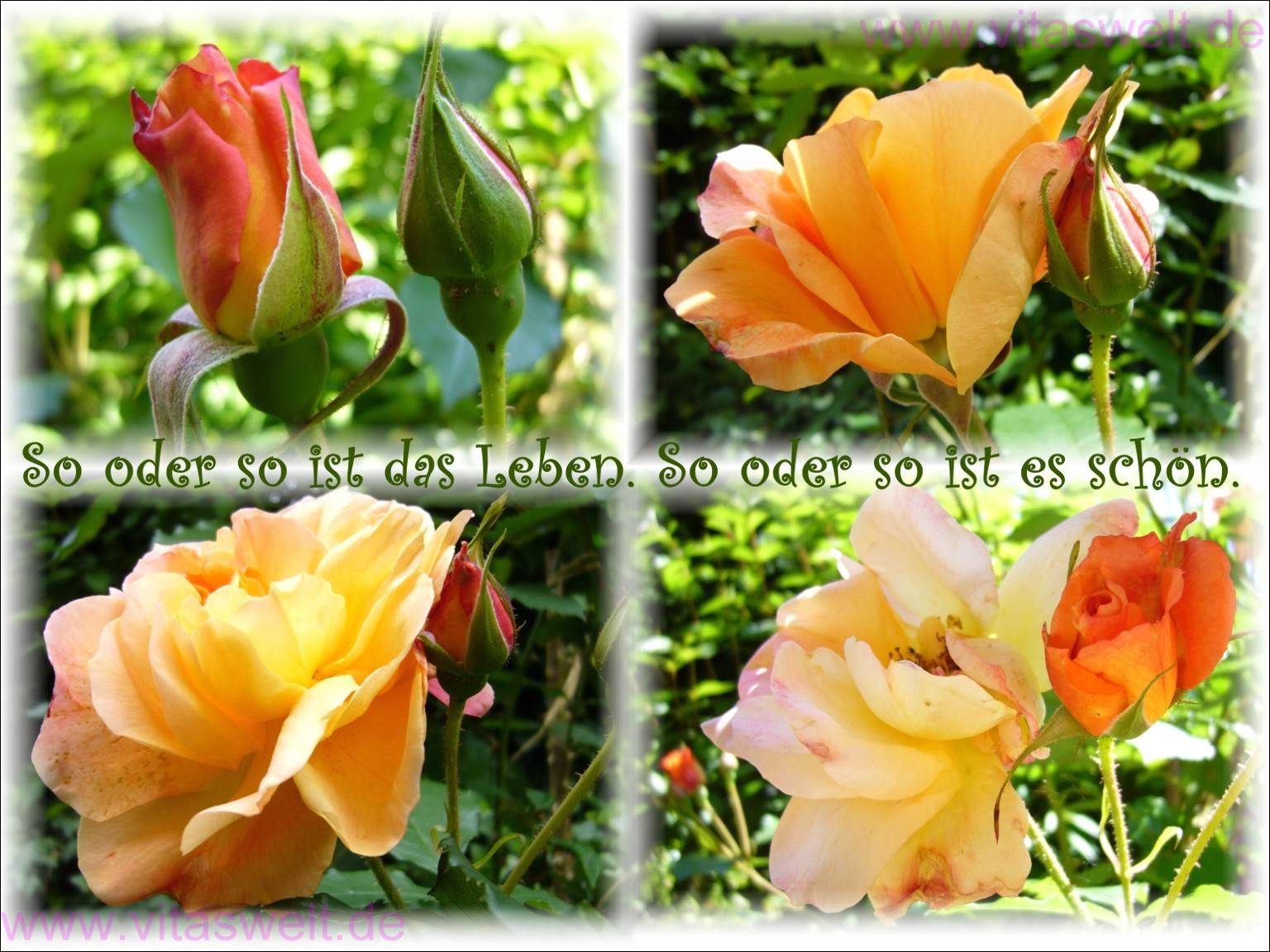 | B20** "So oder so ist das Leben. So oder so ist es schön." steht in kleiner schnörkeliger Schrift inmitten der Karte. Diese ist in 4 gleiche Rechtecke geteilt. In jedem Rechteck ist das selbe Motiv zweier orange-aprikot-gelber Blüten einer Rose zu sehen. Das ganze zeigt, in der Seitenansicht, die Entwicklung von der Knospe über die sich öffnende, dann ganz offene und am Schluss fast verwelkte Blüte. Das Schöne daran ist, dass die zweite Knospe, auf dem ersten Bild noch ganz grün, am Ende dann genau so aussieht, wie die erste Blüte am Anfang. Der Hintergrund ist jeweils hell- und dunkelgrün. Das Ganze wirkt sehr frisch und wurde innerhalb von 5 Tagen, jeweils um die selbe Uhrzeit fotografiert. Die Rose trägt den Namen "Westerland" und duftet stark. Mail mit der Karte B20 versenden Karte B20 bestellenKarte B20 vergrößern | |