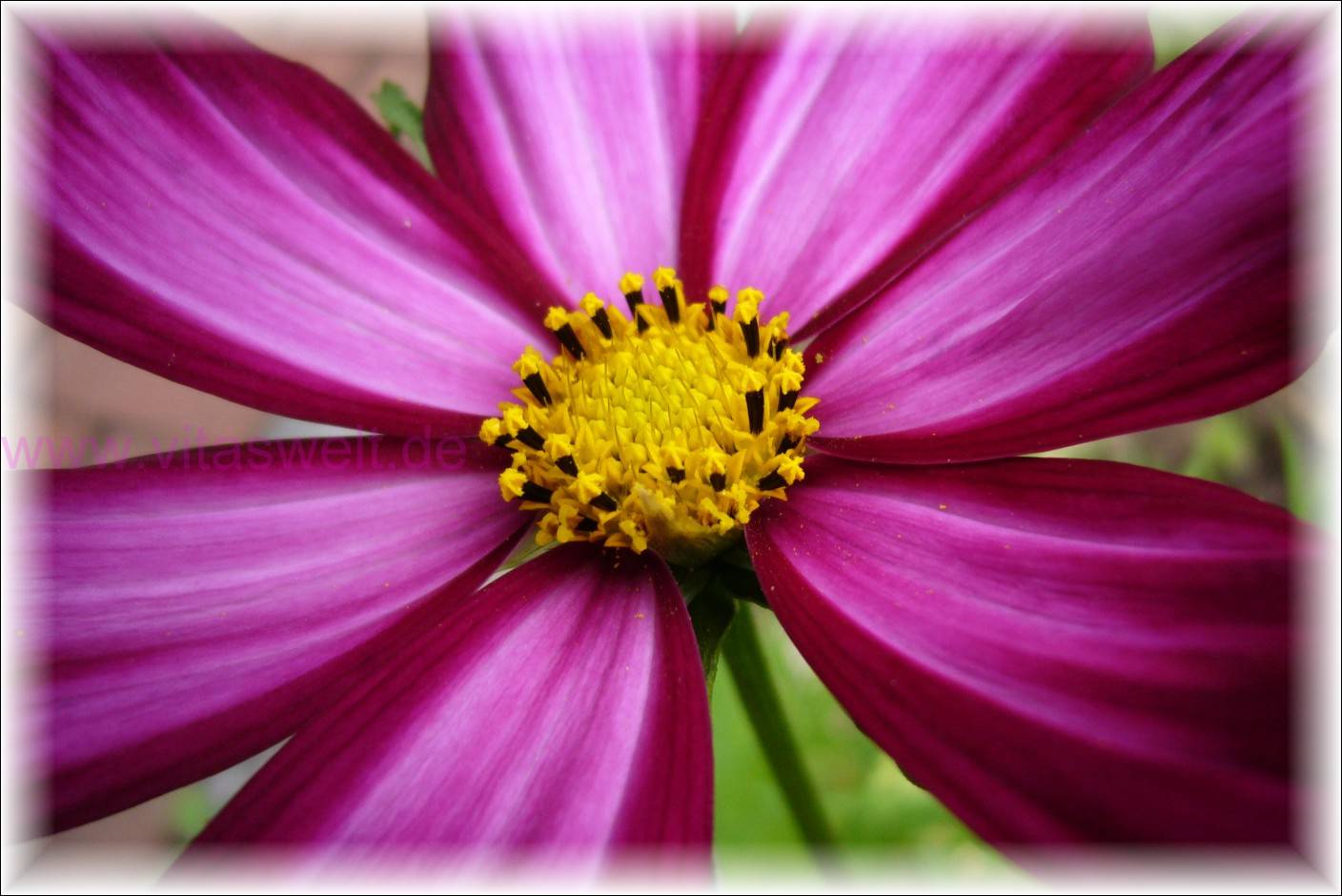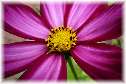 | B23 Hier wurden die 7 schmalen, sich flach nach außen streckenden Blütenblätter einer Kosmea in Nahauf-nahme fotografiert. Die Blütenblätter sind pink, nach innen hin werden sie immer cremiger ins Weißrosa. Der gelb- schwarze, runde Pollenträger füllt die Bildmitte und ist gestochen scharf, während die Bildschärfe nach außen hin nachlässt. Durch einen schmalen Zwischenraum zwischen den Blättern sieht man leuchtend- grünes und den zierlichen Stängel. Eine alltägliche, problemlose Sommerblume stark in Szene gesetzt. Mail mit der Karte B23 versenden Karte B23 bestellenKarte B23 vergrößern | |