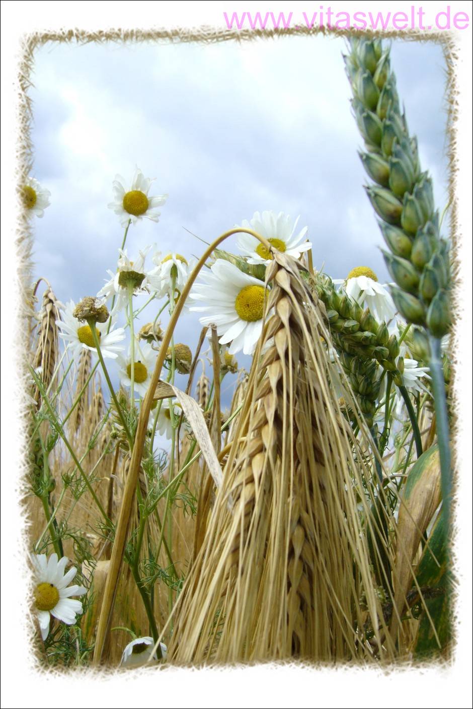 | B24 Die am Rand wie Heu ausgefranste Karte zeigt vor einem blauen mit Wolken verzierten Himmel den Teil eines Kornfeldes. Hier lag ich fast auf dem Boden und habe so in den Himmel fotografiert. Die Ähren wirken so mächtig und groß. Man sieht goldgelbe Gerste mit den langen Grannen (Haare) sowie eine grau-grüne Weizenähre, die sich in den Himmel streckt. Dazwischen tummeln sich einige Margeritenblüten gen Himmel. Bemerkung: Das Feld knisterte und die Feldlärchen zwitscherten hoch oben in der Luft. Schmetterlinge und Wind trieben ihr Spiel. Eine gute Ernte ! Mail mit der Karte B24 versenden Karte B24 bestellenKarte B24 vergrößern | |