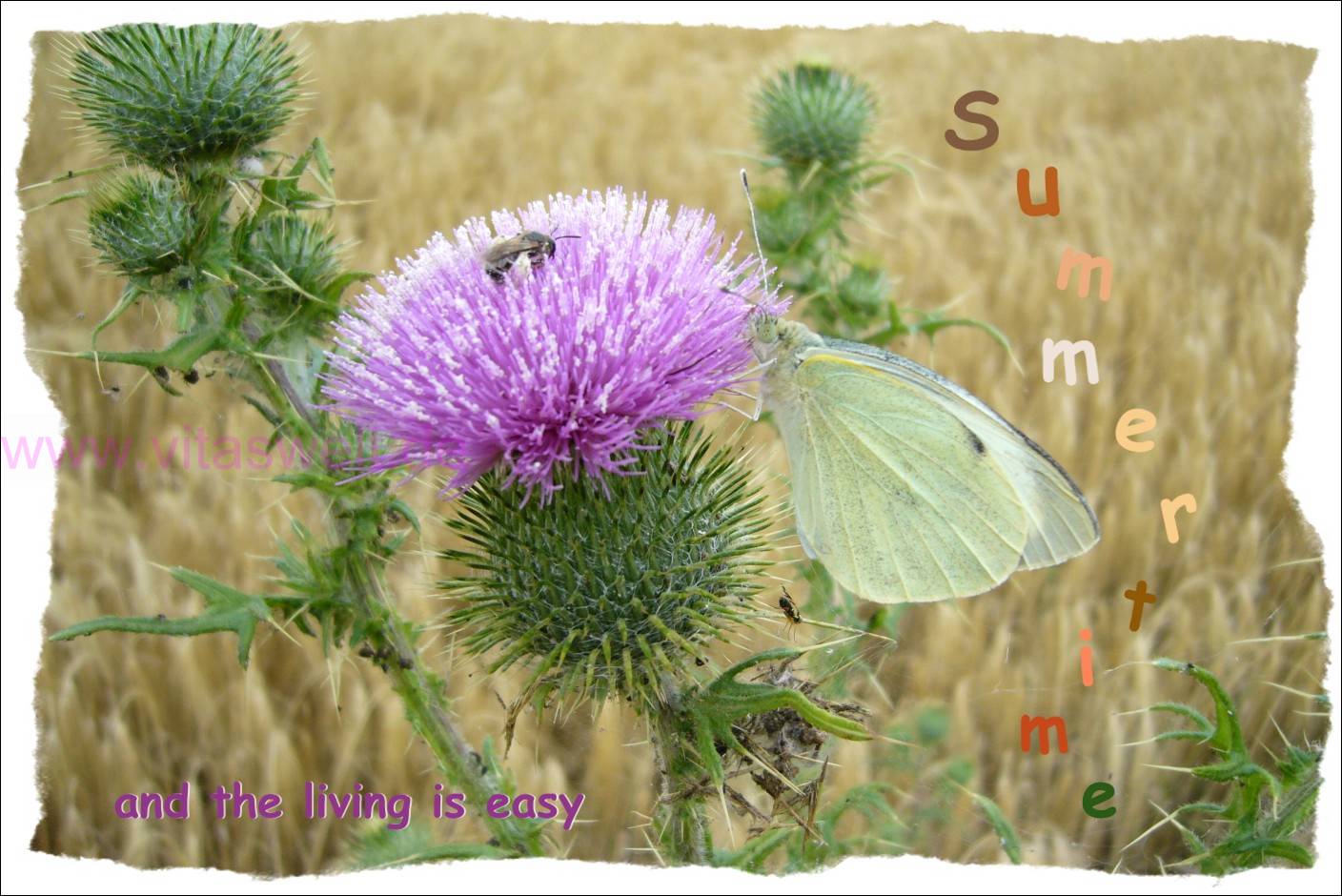 | B25 "Summertime and the living is easy." Summertime purzelt in erdig -naturnahen Buchstaben am rechten Rand der Karte, wie ein flatternder Schmetterling, herunter. Der Rest des Spruches steht etwas kleiner in zartlila am unteren, linken Kartenrand. Die Farbe findet sich auch in der aufgehenden Blüte der abgebildeten Distel wieder. Dort sitzt ein weißlicher Schmetterling (Kohlweißling) und labt sich am Nektar. Mitten auf der Blüte sitzt auch noch eine Biene. Die Blüte sitzt wie ein Hut auf der kreisrunden, stachelig-grünen Frucht der Distel. Im Hintergrund sind weitere Stachelige Kugeln unscharf zu erkennen. Der Hintergrund ist ein goldgelbes Kornfeld. Kartenrand uneben Mail mit der Karte B25 versenden Karte B25 bestellenKarte B25 vergrößern | |