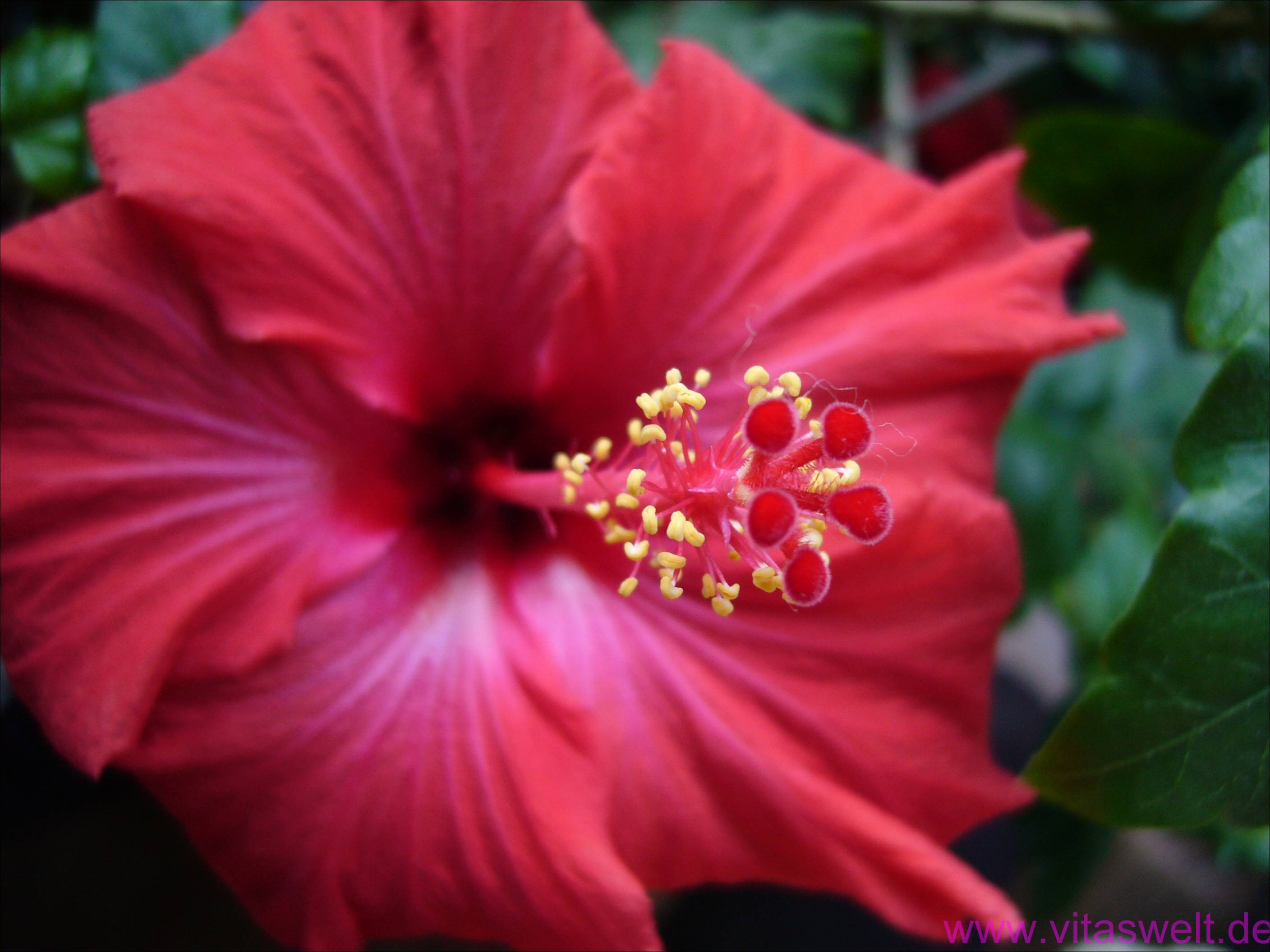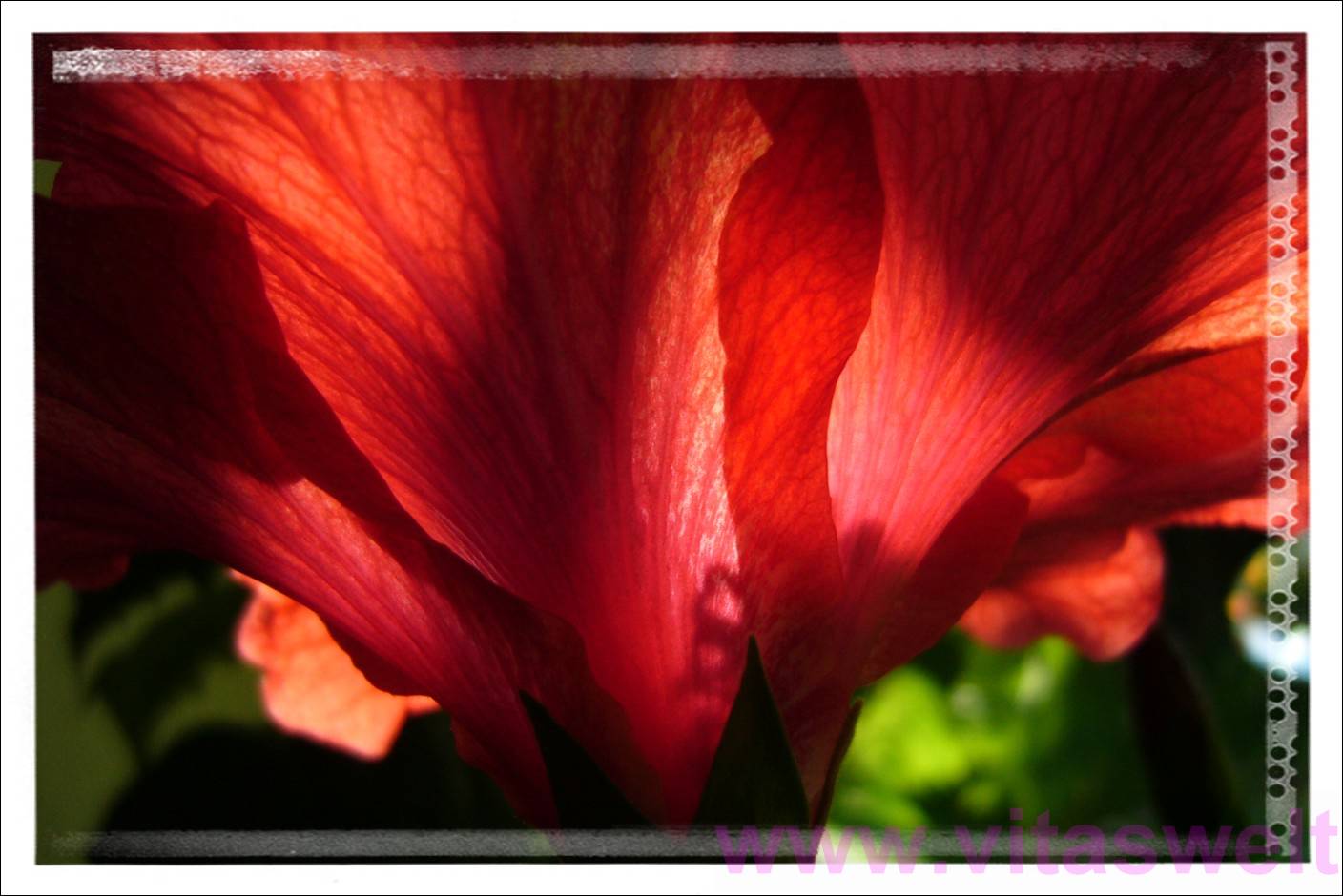 | B26 Feuriger dunkelrot leuchtender Blütenkelch einer sich öffnenden Hibiscusblüte. Vom unteren Rand der Karte entblättert sich nach oben hin bis in die Ecken diese Blüte, die von hinten durch die Sonne angestrahlt wird. Durch die sich überlappenden Blütenblätter schimmern in den verschiedensten Rottönen die einzelnen Nährstoffführenden Äderchen. Helle und dunklere Stellen enstehen durch Beschattung anderer Blütenteile. Der gezackte Blütenkelch in der unteren Bildmitte und die freien Stellen links und rechts davon erscheinen in dunklen und saftigen Grüntönen. Purer Genuss. Mail mit der Karte B26 versenden Karte B26 bestellenKarte B26 vergrößern | |