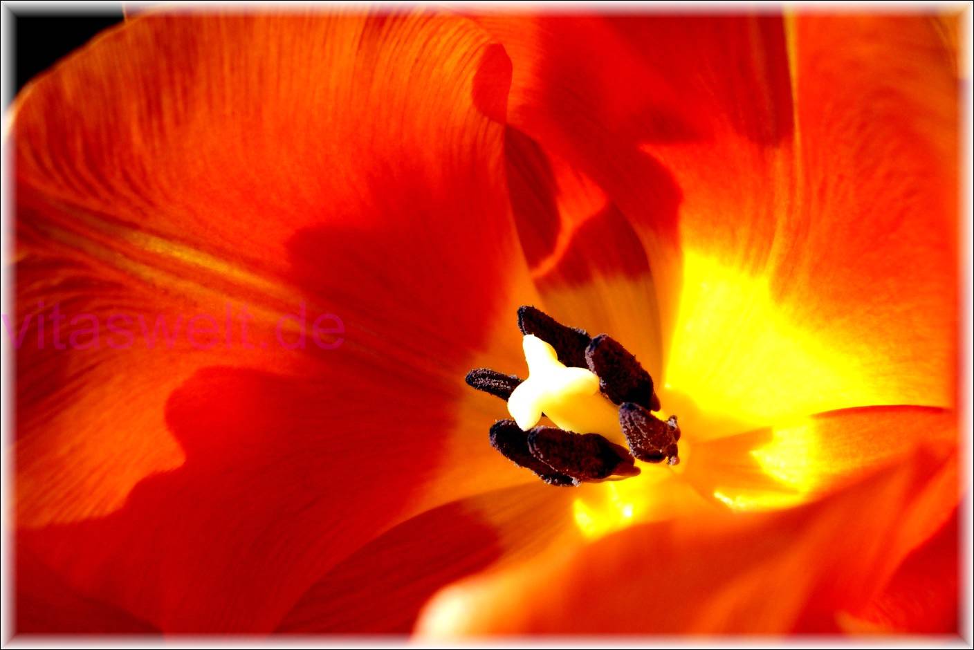 | B28** Diese geöffnete rote Tulpe wurde schräg von oben als Macroaufnahme fotografiert. Sie schauen auf den schräg aufragenden hellen Blütenstempel mit seinen rundherum angeordneten dunkelroten Pollenfäden. Zum Stiel hin färbt sich die Tulpe gelb, nach außen hin ist sie von der Sonne durchflutet leuchtrot. An den sich leicht überlappenden Blütenblättern kann man Wasserführende Leiterbahnen erkennen. Licht und Schatten spielen miteinander. Voll ausgefülltes Querformat. Mail mit der Karte B28 versenden Karte B28 bestellen Karte B28 vergrößern | |