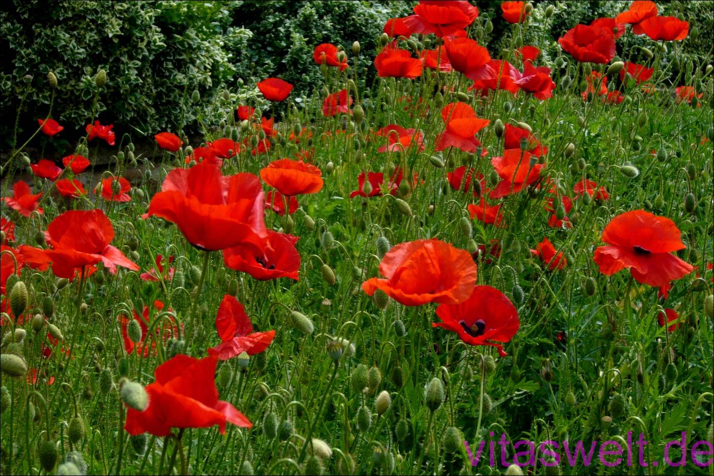 | B29 Der rote Klatschmohn (Papaver rhoeas) ist immer wieder ein beliebtes Fotomotiv. Warum eigentlich ? Hängt es an der raschen Vergänglichkeit der hauchdünnen, fast knitterigen Blütenblätter die auf Spagettidünnen, behaarten Stielen stehen, die im Winde wiegen? Hier sehen Sie ihn als rote Blütenflecken verteilt auf einem Klatschmohnfeld. Die Schrägaufsicht von oben vermittelt Tiefe und ein schöner Kontrast entsteht dadurch zum saftigen Grün der Pflanzen. Satte Farben zum Sattsehen. Mail mit der Karte B29 versenden Karte B29 bestellenKarte B29 vergrößern | |