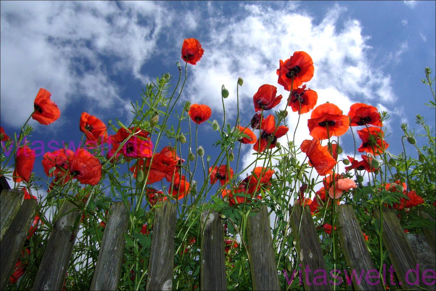 | B30** Hier sind einzelne Mohnblüten und -Knospen sozusagen in den Himmel gewachsen. Die Pflanzen strecken ihre Köpfe über einen alten Holzlattenzaun. Da ich aus der Froschperspektive gen Himmel fotografierte, bietet das Motiv eine gewisse Spannung. Der knallblaue Himmel mit leichter Bewölkung: zu den roten Tupfern ist einfach himmlisch! Mail mit der Karte B30 versenden Karte B30 bestellenKarte B30 vergrößern | |
