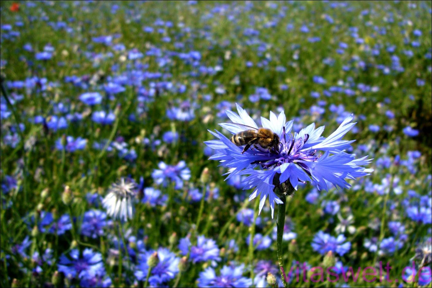 | B32 Ein blaues Kornblumenfeld findet man heute nur selten. Wir haben es für Sie entdeckt und wünschen viel Phantasie beim Versenden. Im Vordergrund ist eine Blüte scharf abgebildet. Die Blüten haben feine miteinander verzweigte Blütenblättchen, als Kelche geformt, die kranzförmig nach außen abstehen. Sehr bizarre Form. Ich würde sie mit Schneekristallen vergleichen. Auf der abgebildeten Blüte sitzt eine Biene und labt am Nektar. Die volle Bildfläche ist, durch die Schrägansicht, mit blauen Blüten im grünen Feld ausgefüllt. Sommerlich leicht. Mail mit der Karte B32 versenden Karte B32 bestellenKarte B32 vergrößern | |