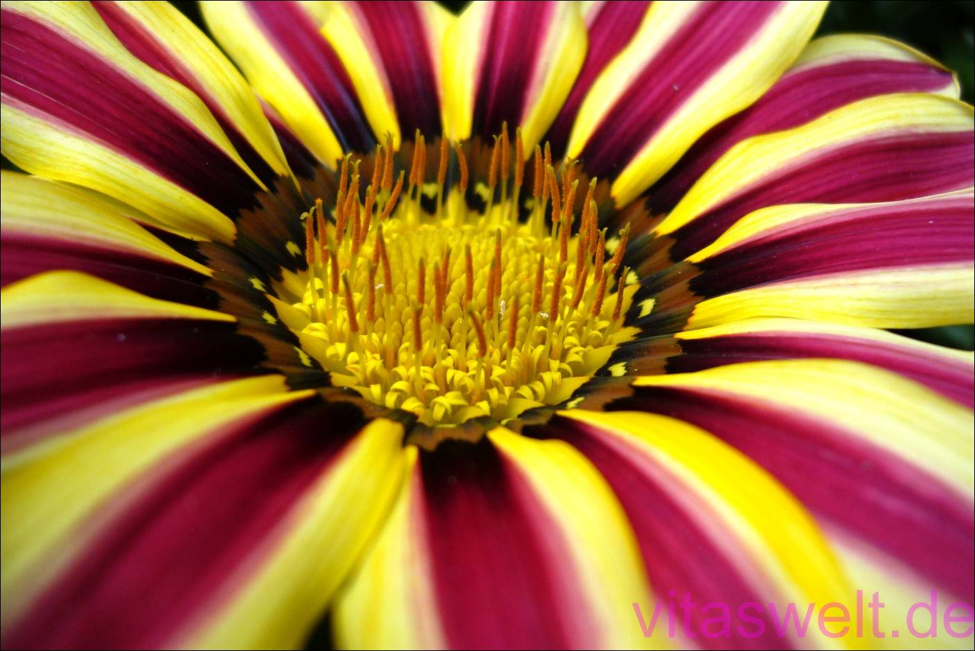| B33** Nahaufnahme einer gelb- lila- weiß gestreiften Mittagsblume. Um die Sahnegelbe Mitte der Blüte reihen sich viele viele schmale längliche Blütenblätter. Auf der Blütenmitte stehen rundherum viele nadelgroße Pollenstiele mit orangen Pollen. Wirkt durch die vielen farbigen Streifen auf den Blütenblättern irgendwie exotisch. Mail mit der Karte B33 versenden Karte B33 bestellenKarte B33 vergrößern | |